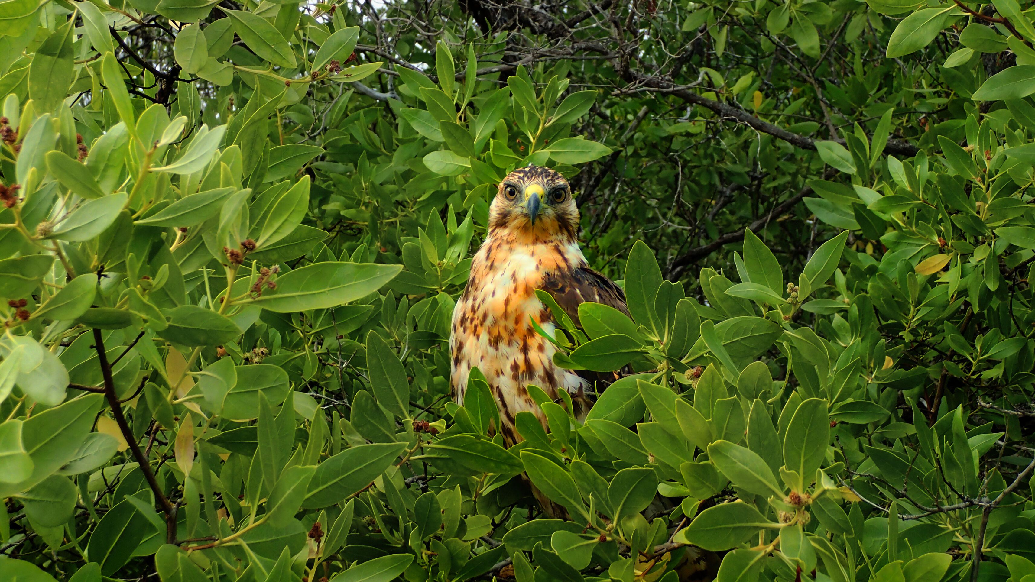 Sadly, our expedition aboard National Geographic Gemini is nearing its end. Our day began with a hike at the base of towering cliffs. A steep ascent led us to a plateau of a palo santo forest, sparse and otherworldly. Almost immediately, we were surrounded by red-footed boobies nesting in low trees and Nazca boobies on the ground. A highlight was spotting a short-eared owl perched silently among a lava crevice, camouflaged and hunting storm petrels. The calls of frigatebirds rang in the air, with their inflated red pouches on full display in a mating show. After our hike we enjoyed water activities, such as kayaking along the cliffs and snorkeling. In the late afternoon, we landed on the coral sand beach of Darwin Bay. Guests enjoyed a relaxing stroll along the shoreline bordered by mangroves and nesting bird colonies. The presence of swallow-tailed gulls, lava herons, and marine iguanas provided excellent photo opportunities.