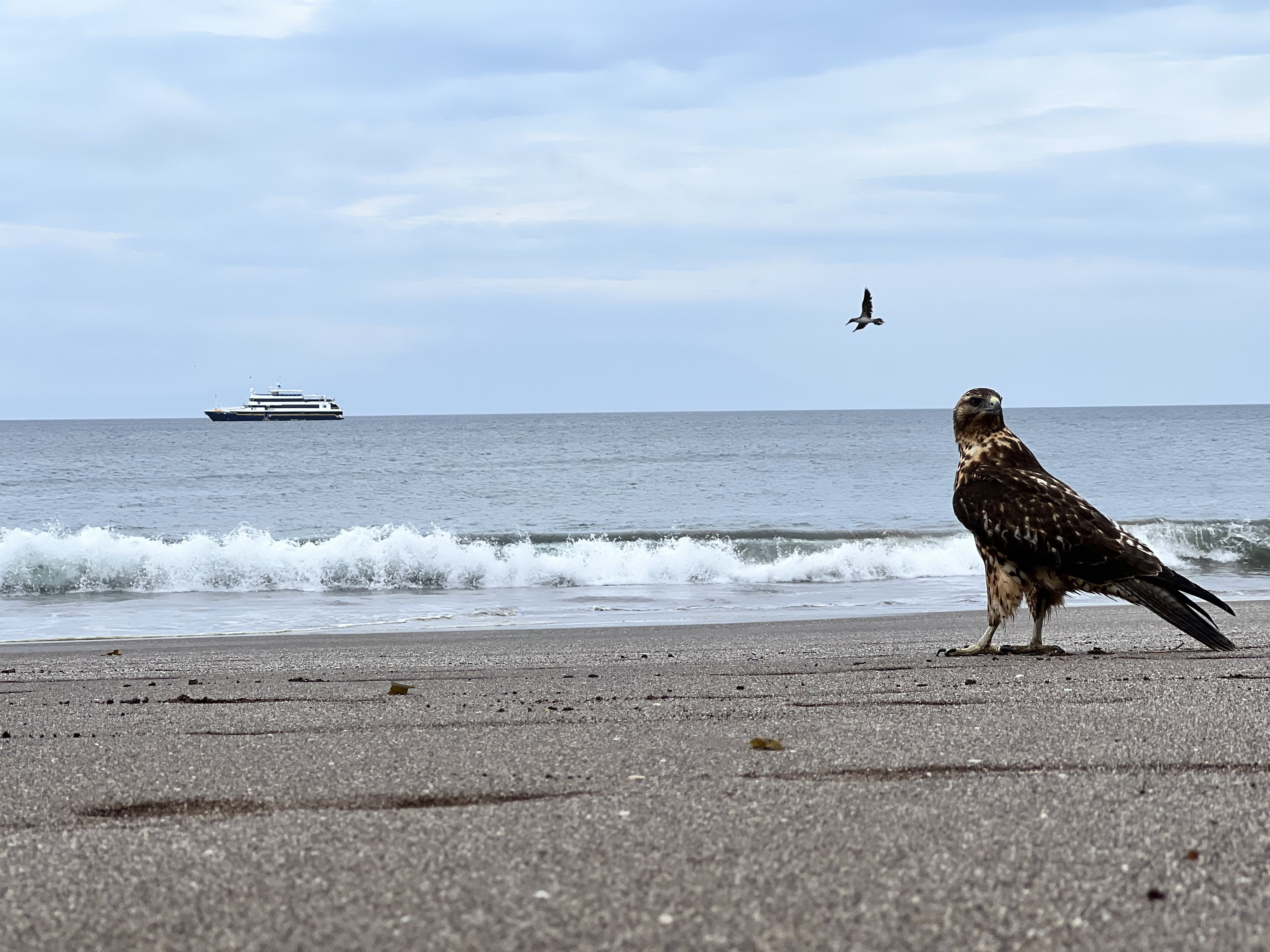 We spent our day following Charles Darwin’s steps on Santiago Island, a place he spent nine days exploring. National Geographic Islander dropped anchor at Espumilla Beach. We started early in the morning with invigorating kayaking along the shoreline and a leisurely walk on the beach. I was fortunate to lead the walk on Espumilla. We saw Pacific green sea turtles swimming very close to the shore, as well as a good number of blue-footed boobies and brown pelicans diving for fish. Along the shore, we observed Galapagos mockingbirds and yellow warblers jumping from branch to branch. A juvenile Galapagos hawk stood quietly in the button mangrove while observing us with an exhilarating curiosity and tameness. As we decided to continue our exploration, the juvenile hawk decided to follow and constantly looked to us for our attention, as if trained to do so! The hawk followed until we boarded the ship. It was a fantastic moment!