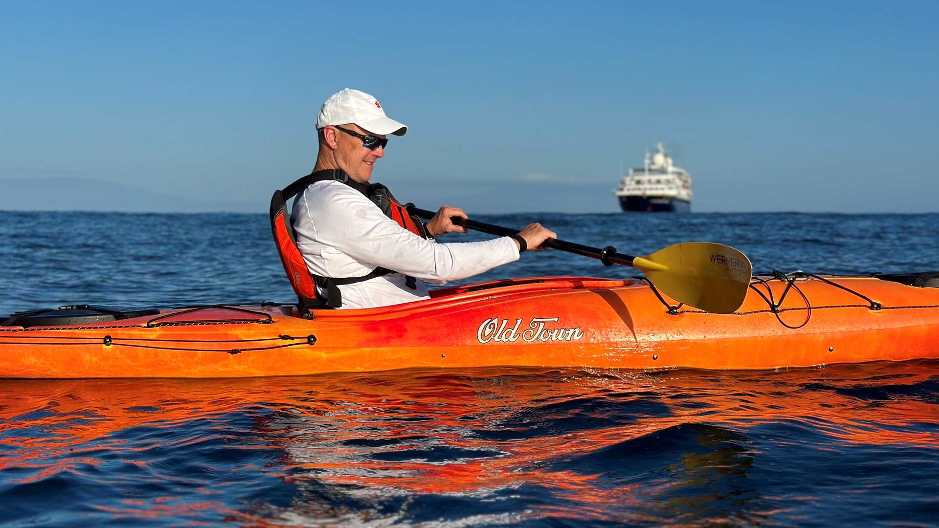 On the last full day of our expedition in the Galapagos, we started the morning with a sunrise kayak session along Buccaneer Cove, located on Santiago Island. We were surrounded by amazing volcanic formations, and we spotted marine birds and mammals while paddling there. After breakfast, we submerged into the marine ecosystem where we enjoyed snorkeling and a boat ride in the glass-bottom boat.
