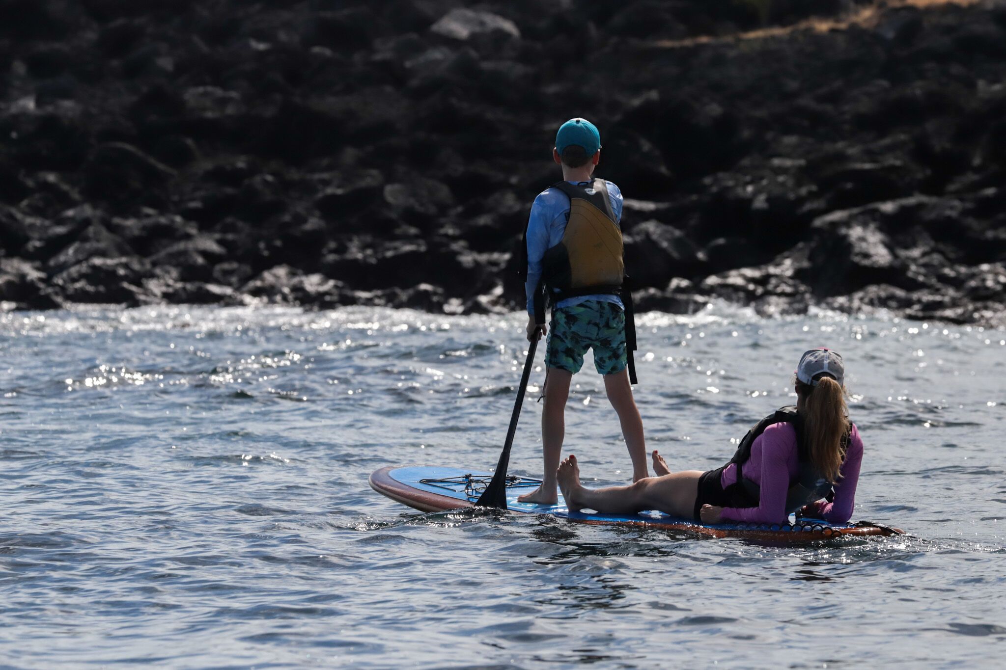 After breakfast, we anchored in Buccaneer Cove, an eroded shoreline located on the northwestern flank of Santiago Island. We explored the scenic visitor site that was frequented by pirates in the 19th century and by Charles Darwin when he arrived on the HMS Beagle in 1835. Some guests decided to explore the natural caves and eroded tuff cones with kayaks and paddleboards, where they spotted brown pelicans and Nazca boobies. At the same time, other guests preferred viewing the undersea wildlife from aboard the glass-bottom boat or while deepwater snorkeling.