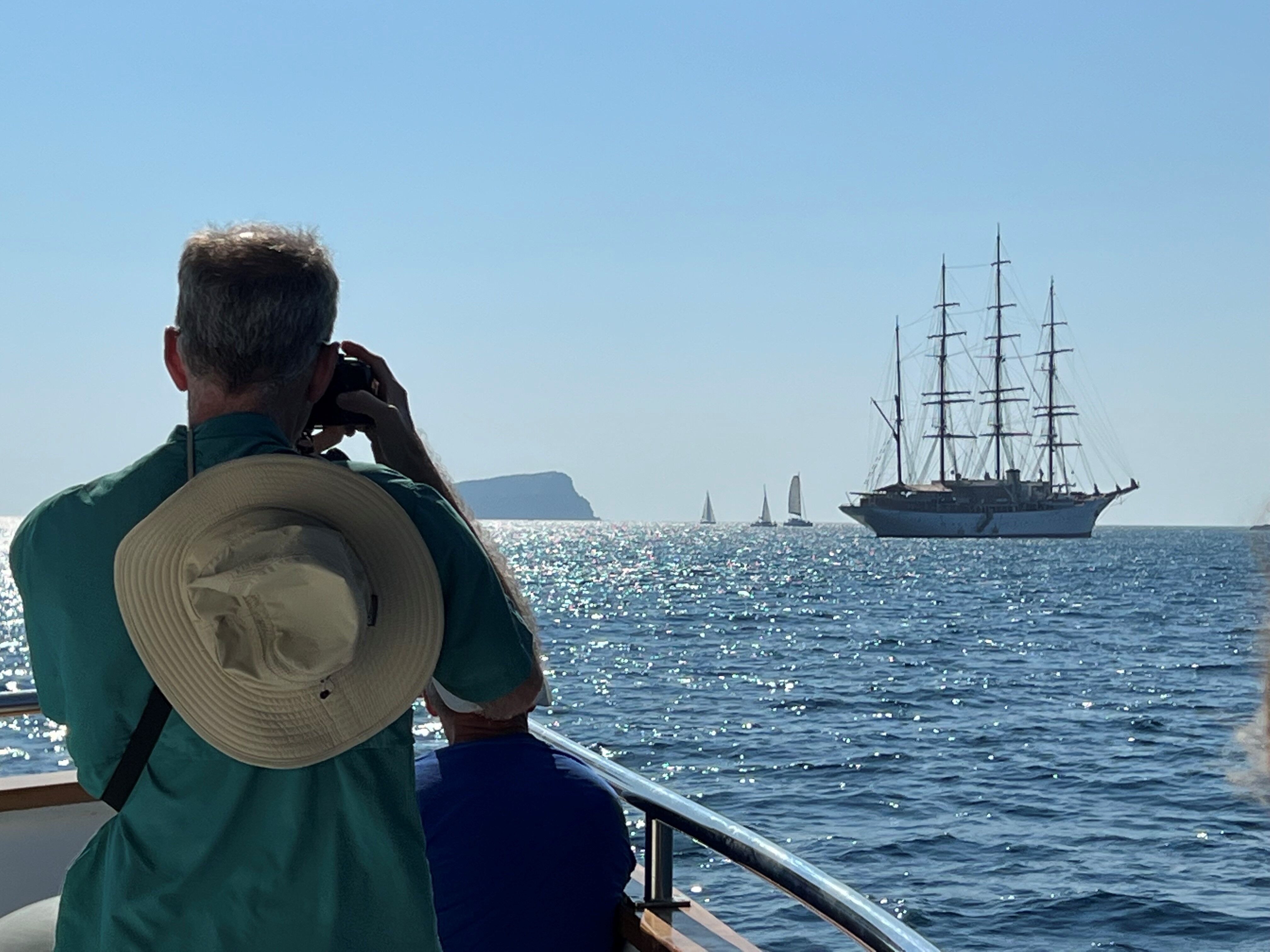 The unofficial guardians of Delos greeted us this morning, a clipped-ear furry brigade of assorted color and heritage cats. The resident peacock could be heard calling back by the lion statues. Welcome to the center of the Greek mythological world, the “floating island” of Delos. In ancient times, the sounds would have been associated with the hustle and bustle of commerce, or perhaps the oration of a play in the theater. This morning, the crested larks sang as we wandered through a historical landscape with engaging narration by Evangelos and Dionysis, our two Greek guides. A climb to the top of Mount Kynthos topped our terrestrial explorations, and a dip in the Aegean upon our return to the Sea Cloud topped our aquatic explorations. The day ended with a mix of voices in a boisterous sea shanty sing-along, which evolved into a dancing under the stars melee on deck. Another memorable day hosted by the good ship Sea Cloud and her tireless crew.