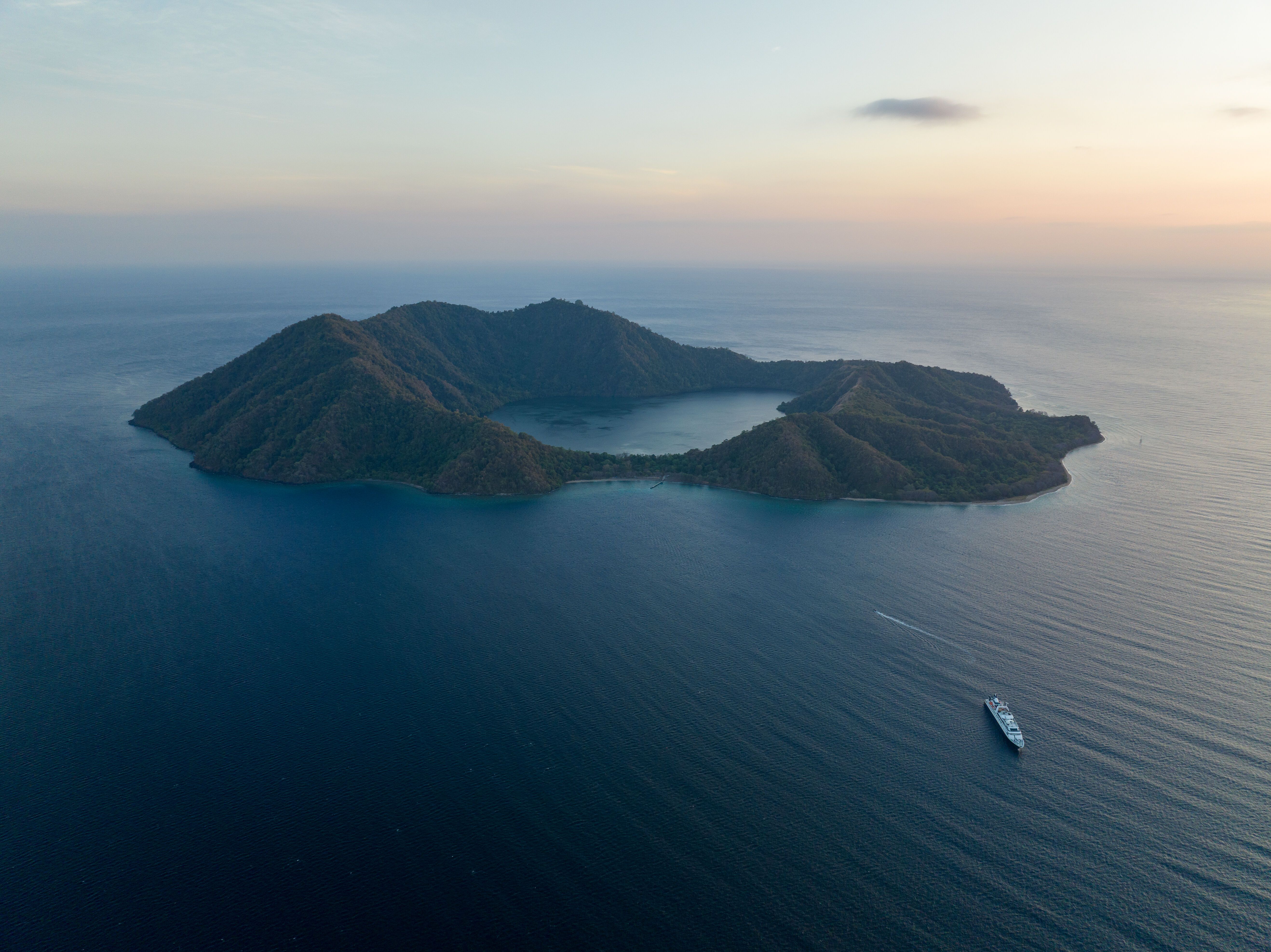 Guests awoke to beautiful sunlight and watched the first rays break across the jagged pinnacles of the Indonesian skyline. The closest and most distinct peaks belonged to the uniquely formed Satonda Island. This unusual landmass is the crater of a previously active volcanic pinnacle. Over time, this central crater has filled with seawater, leaving behind an almost perfectly circular ring of tropical forest that is home to a plethora of flora and fauna. Wellness specialist Belinda began the day with morning stretches for those inclined. On offer at a similar time was a sunrise hike. This was a great option for both avid birders and walkers alike. Upon arrival, guests were greeted by long-tailed macaques patrolling the beaches and a cacophony of enticing birdsong. The first point of interest was the central lake, which was a short walk from the landing. From here, guests had the option to take the ascent up to the nearest vista and enjoy stunning views of the island’s interior.