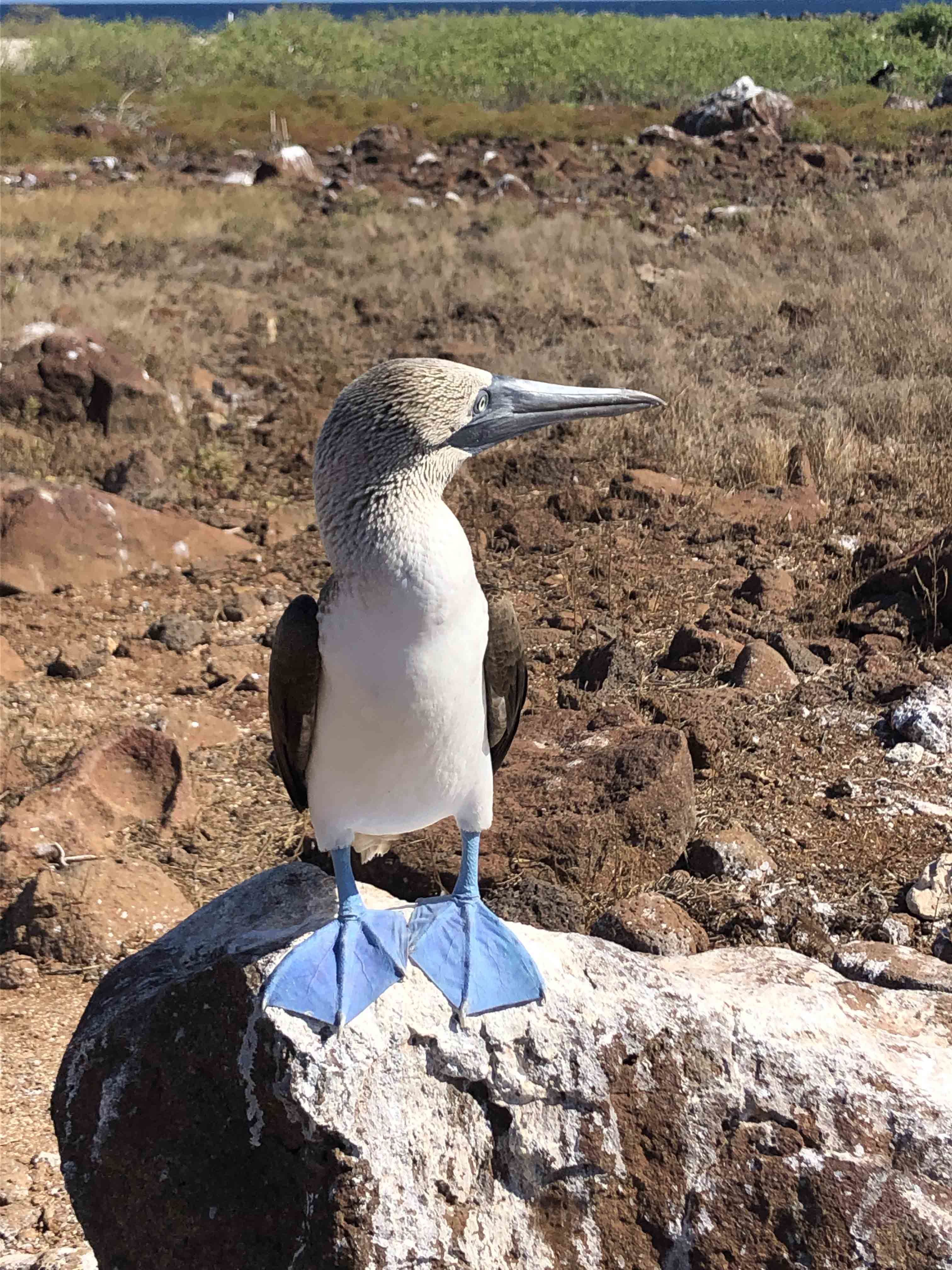 We started our hike, getting deep into the dry vegetation; the landscape was stunning, contrasted against the turquoise water. Just to experience the fearlessness of the animals that surrounded us, including blue-footed boobies, frigatebirds, swallow-tailed gulls, marine iguanas, land iguanas, sea lions and more. Magnificent and great frigatebirds were actively taking care of their young in the nests, or waiting with their pouches blown up, searching for a mate. We did not need binoculars to spot boobies nesting with their eggs and chicks, as well as juveniles that were just in the trail.