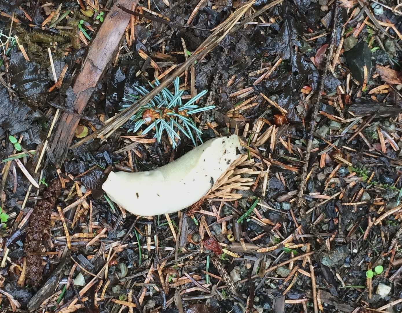 It was a day late in the summer of 2016, and it too was cold and wet. I also remembered how the toughest part of the hike was the first 200 feet, getting off the beach, and onto the old logging road that would determine the course of our adventures today. Once on the road though, it was clear walking for the next two miles down to the meadow at the head of the bay, where we hoped to see bears. I also remembered seeing, for the first time in my life, the fabled ghost slugs of Sitkoh Bay! These are a white color morph of the banana slug that I’ve only seen here, and as hard as it may be to imagine it, I look forward to seeing them whenever we are in the neighborhood.