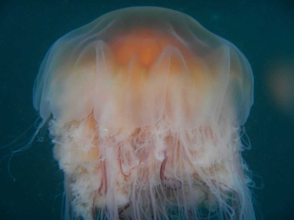 We piled into expedition landing crafts for our ride to shore and walks among the tall trees but first we were treated to water stars of an orange and tan color. For reasons of their own, lions mane jellies crowded the inlet on their undulating journeys. The water was dotted with their bodies. They flared out into star shapes and then folded their mantles before flashing the star again. The tendons stretched on behind them in a train of stinging potential.
