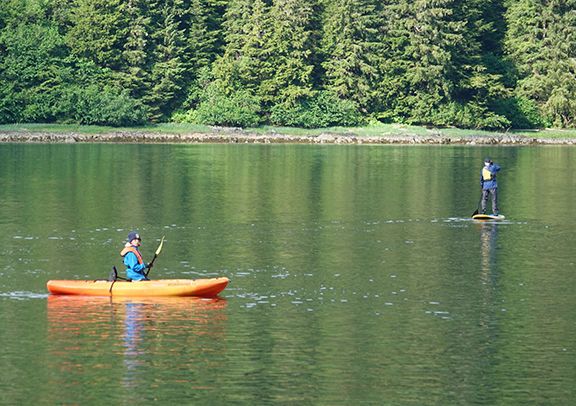 The day began with calm water allowing for kayaking and paddleboarding in Sitkoh Bay. Banana slugs were immensely popular with the children—and young at heart—on all the hikes. The thimbleberry bushes were in full bloom and, in a few weeks, bears will surely delight in eating them. Everyone took turns with the kayaks and hiking and then headed back to the ship for lunch. After lunch, we had a presentation and then set out for more hiking near Lake Eva in Hanus Bay. Numerous wildflowers were in bloom and the naturalists explained the rainforest ecosystem. After dinner we enjoyed an incredible sunset and spotted numerous humpback whales spouting and displaying their flukes.