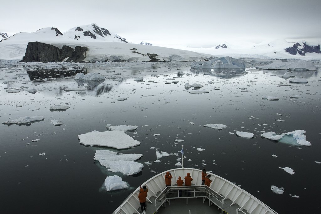 National Geographic Resolution spent the day surrounded by icebergs and sea ice in Crystal Sound as the weather got sunnier throughout the day. Guests experienced Detaille Island during the morning activities. Everyone went on guided Zodiac rides around the island where we saw numerous crabeater seals and icebergs. We stopped to observe an Adelie penguin colony, including dozens of penguins waiting to jump in the ocean. Many people went on shore to see the historic research hut from 1956-58, including all the original canned food and equipment kept in pristine condition. Some guests climbed the snowy hill to see the top of the penguin colony across a deep ravine. In the afternoon, the ship cruised around Crystal Sound so we could see the sea ice, glacial icebergs, and huge tabular icebergs. There were beautiful blue sea caves and arches in many of the icebergs, as well as dozens of crabeater seals on the sea ice. However, two humpback whales stole the show when they appeared in the sea ice near the ship. We could hear their loud exhaling and see them diving up close. The rest of the day was spent relaxing, enjoying a presentation, cocktail hour, recap, and dinner as the sun showed brightly in the west. What a perfect day to end our awesome week in Antarctica.