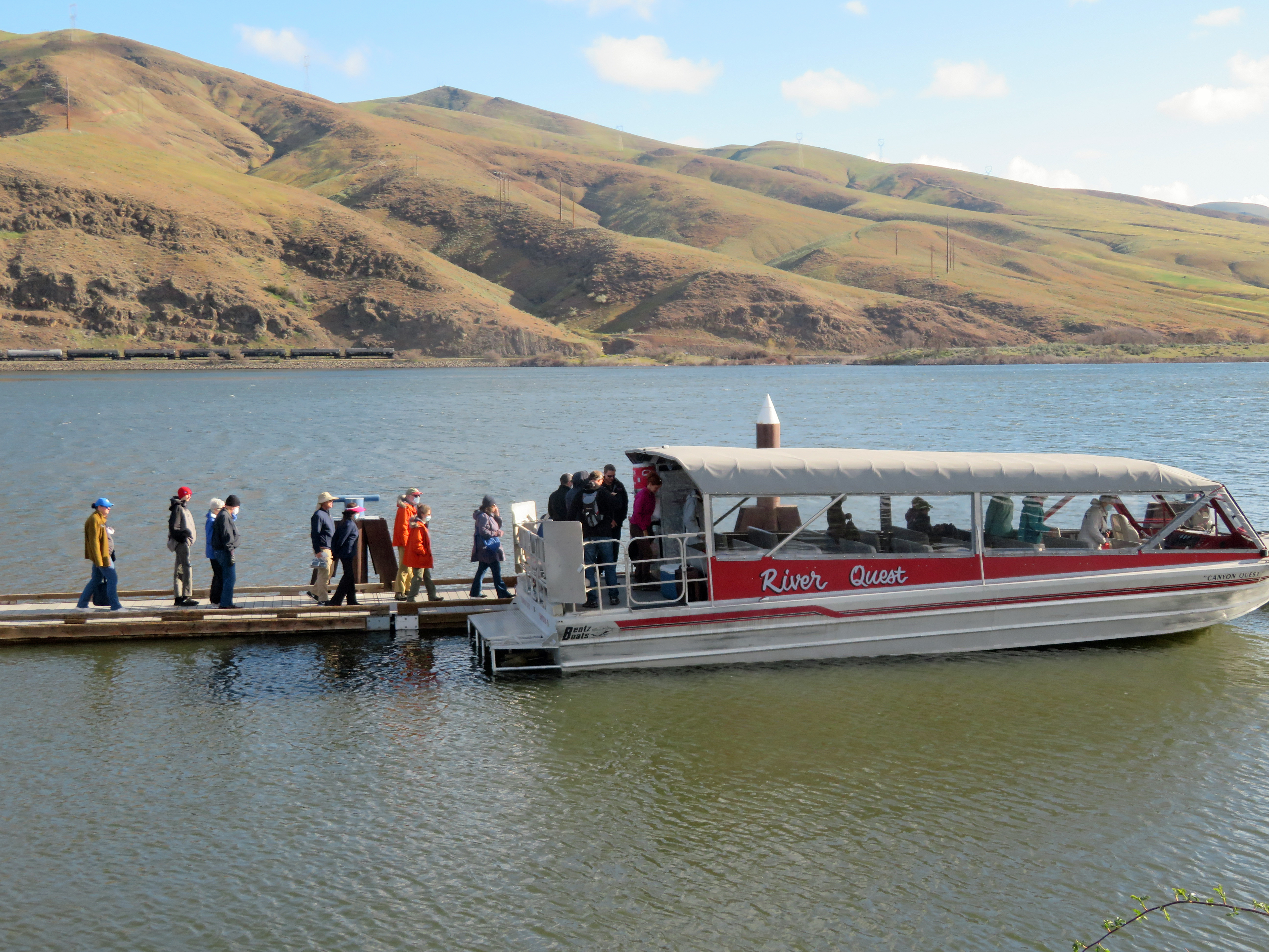 After passing the town of Asotin, leaving the pool of Lower Granite Lock and Dam, and entering the free-flowing Snake River, we slowed to view fan-shaped columnar basalt. We continued to scan this rugged area for its myriad of flora and fauna. Over the course of the day, we were rewarded with views of eagles, white pelicans, and bighorn sheep. We heard the story of a ranch whose owner still rows across Snake River to reach their car. A band of dogs waits on the bank for the owner’s return. Our forty-eight passenger, custom-made jet boat named Canyon Quest handled the rapids with ease. The boat’s powerful jet drives provided a comfortable and secure ride. We also heard about the 1905 wreck of a steamboat carrying valuable mining equipment, and we viewed Cougar Bar, a location connected to the Lewis and Clark Expedition.