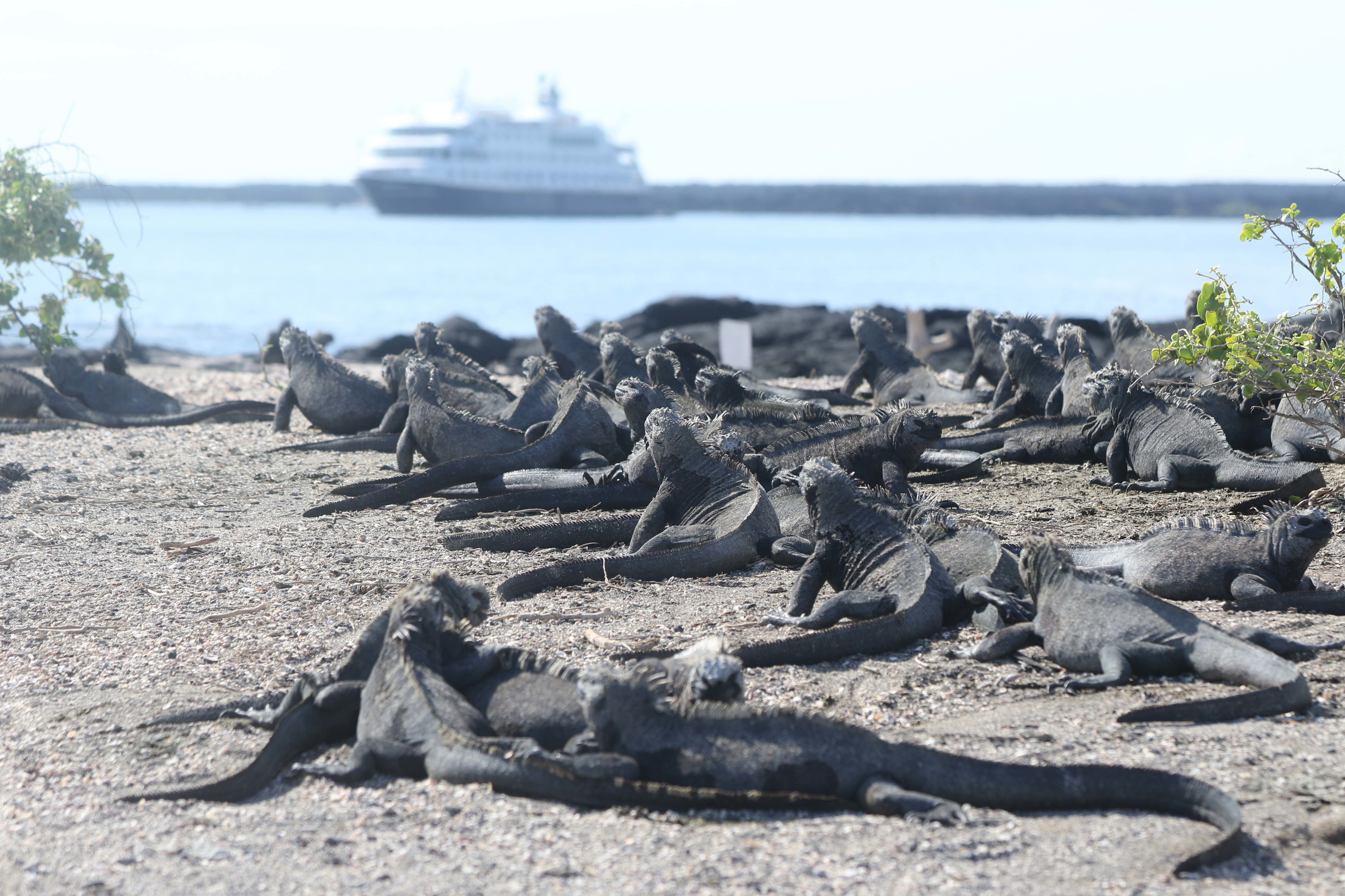 National Geographic Endeavour II continued its itinerary with a visit to the small island of Sombrero Chino, located just 0.1 miles (150 meters) southwest of Santiago Island. Santiago has unique wildlife and a fascinating landscape of rocky shores and lava fields. National Geographic Endeavour II guests enjoyed simultaneous water activities: kayaking, snorkeling, and Zodiac rides. In the late morning, we enjoyed a boat ride along a chain of eroded tuff cones. As we navigated, we passed an enclosed saltwater lagoon. The lagoon was formed by seawater filtrating through the walls of a collapsed tuff cone. We even had the chance to spot a group of Galapagos American flamingos. By the end of the day, we were anchored by Bartolomé Island, a scoria / tuff island formation with a view of Pinnacle Rock. This sandstone formation is one of the most iconic views in the Galapagos. This particular landscape was featured in the movie, Master and Commander.