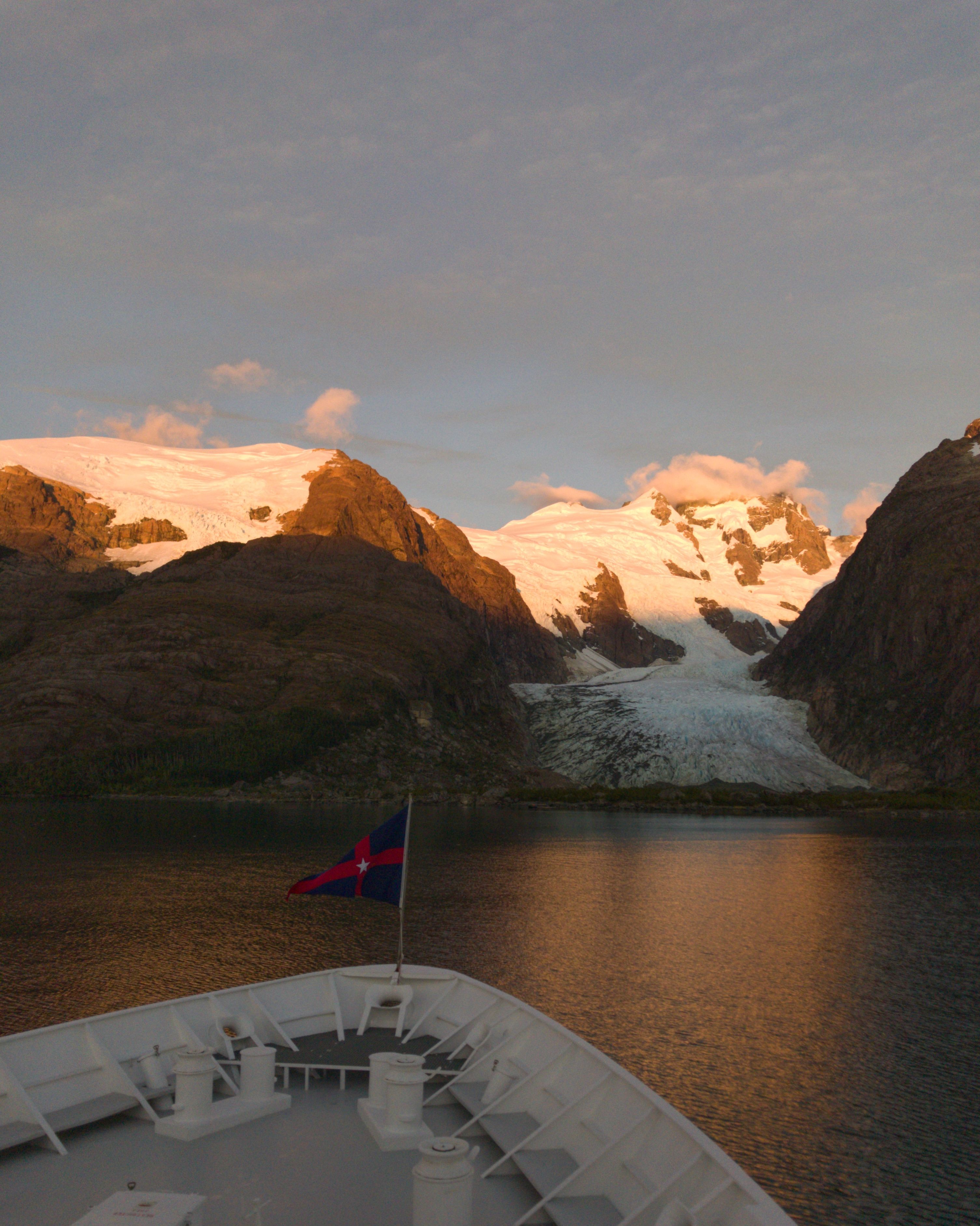 After dinner, we jumped into Zodiacs for one last adventure for the day—an evening cruise around the Welcome Islands. This small archipelago, formed from volcanoclastic sediments with steeply uplifted strata, yielded a rather lovely cave system that we were able to see from the inside via Zodiac!