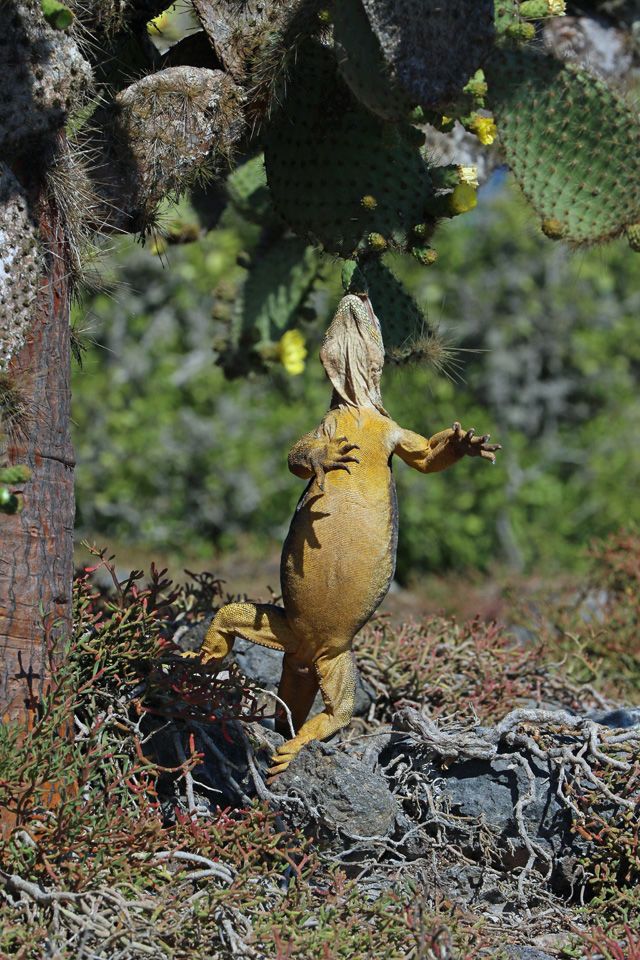 After a beautiful sunny morning hike, we returned to the ship for a refreshing well-deserved dip in the sea, and many even jumped off the ship. This is the beginning of the warm season and the temperature of the water was just perfect! Midday we navigated southbound toward Santa Fe, considered one of the oldest in the archipelago. Its outline is rather flat; therefore, its vegetation belongs to the arid or dry zone typically represented by the opuntia cacti. Here, the Santa Fe endemic species distinguishes itself from other prickly pear species of the archipelago by reaching a girth of up to four feet wide for some very old individuals. Santa Fe has its own species of land iguana, the conolopus pallidus. They are found scattered on the very rocky terrain of the island, where they usually live happily ever in the vicinity of a cactus tree.