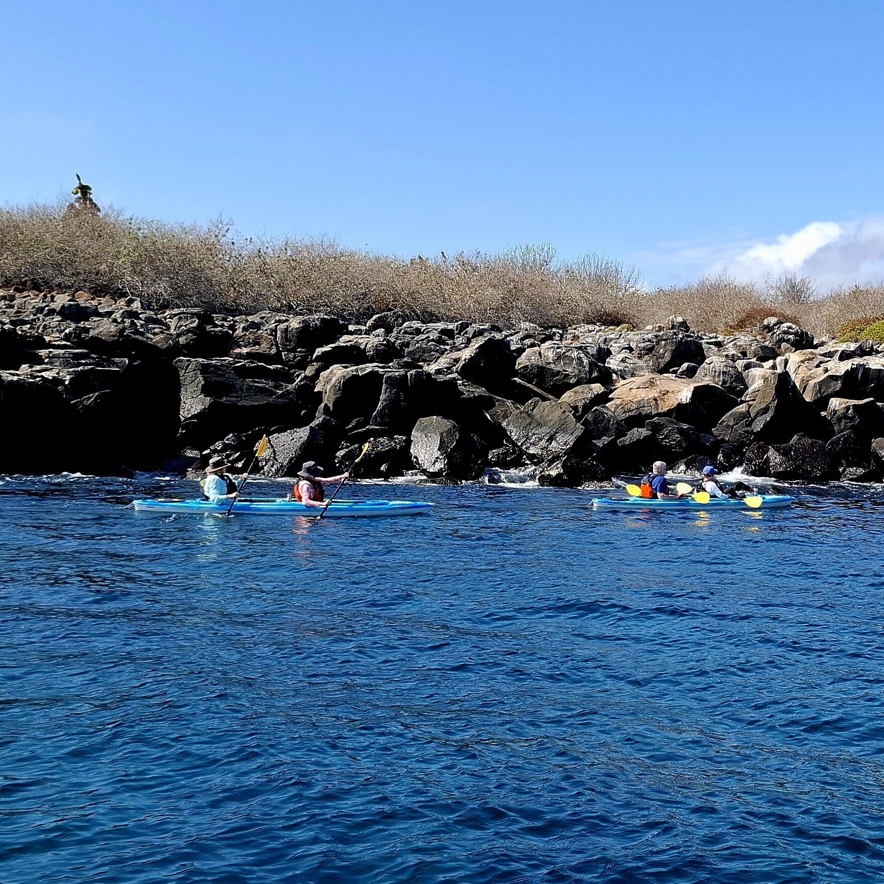 The hot season begs for an early morning start, in order to avoid the crushing heat of midday at the Equator. The first activity on today’s agenda was kayaking around North Plaza Island, followed by breakfast. Afterward we enjoyed a land walk at South Plaza Island where sea lions, yellow land iguanas, prickly pears, red sesuvium bushes, and swallow-tailed gulls combine to perfection. After departure and while motoring to our next destination, National Geographic Islander II was surrounded by hundreds of bottlenose and common dolphins.