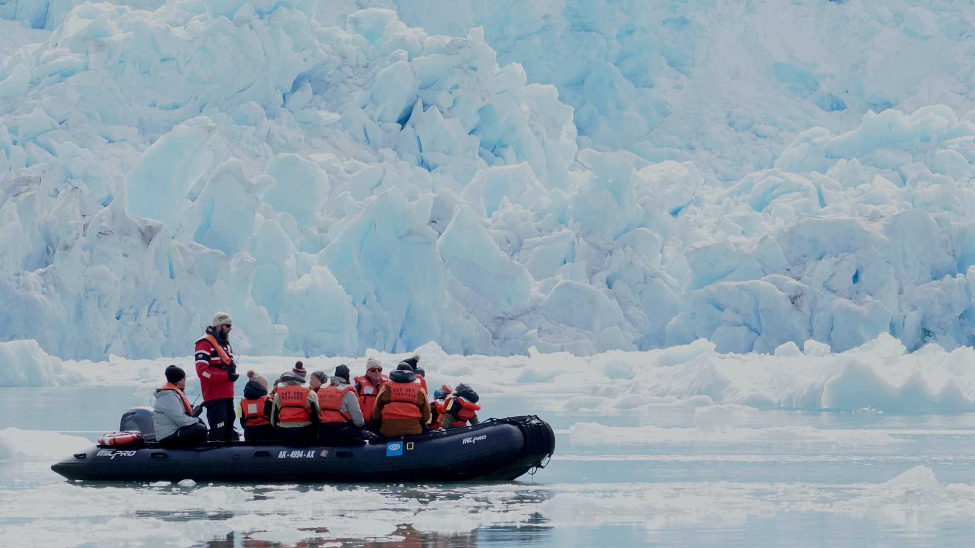As the sun rose, we crossed the bar into Tracy Arm in Fords Terror Wilderness Area. The steep walls and endless waterfalls made for a dramatic scene as we motored toward our destination. We split into two groups, loaded into Zodiacs, and made off for South Sawyer Glacier. We passed by icebergs of all shapes and sizes, and were spied on by curious harbor seals. The face of the glacier was dynamic and thunderous. We were all astounded by powerful calving events, which sent waves our way and put smiles on our faces. And of course, a surprise visit from the cocoa boat was the cherry on top of an awesome visit to South Sawyer Glacier.