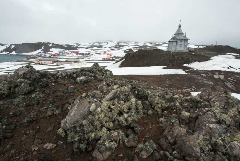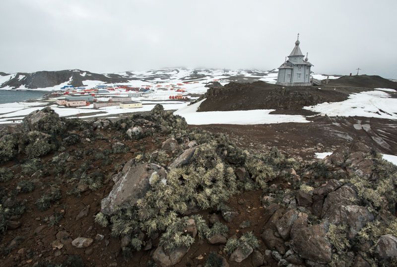 King George Island is part of the South Shetlands and harbors the vast majority of research stations in the area. This morning we “entered” the countries of Chile and Russia and looked across the border towards China and Portugal, just a few of the flags flying along the banks of King George’s Maxwell Bay. Bright orange shipping containers, blue-roofed research stations, large all-terrain vehicles, and even a rope-tow marked the Chilean station. Right next door, on the same beach, the Russian station (Bellingshausen) comes off as a bit more drab in color palette and activity level. With one gleaming exception. Atop a hill overlooking both Frei (Chilean) and Bellingshausen Stations sits a charming Orthodox church, built from Siberian larch and cedar timbers transported by road and then ship down here in 2002.