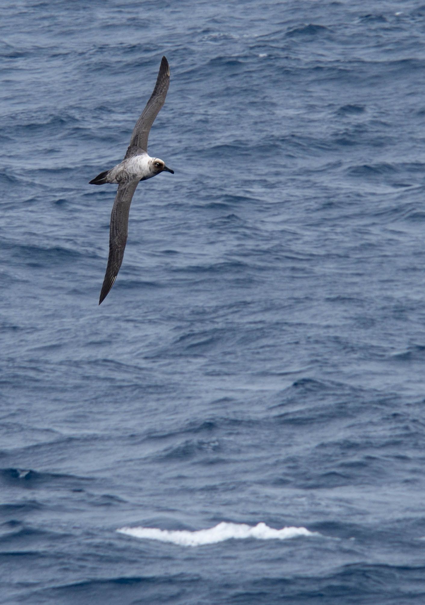 As National Geographic Explorer navigates north, we leave glaciers, snowy peaks and penguin processions in our wake. We cringe against biting winds as we squint to see through the homogenous fog that hovers over nearly freezing, turbulent seas. We are delighted at the sight of a light-mantled sooty albatross alongside us.