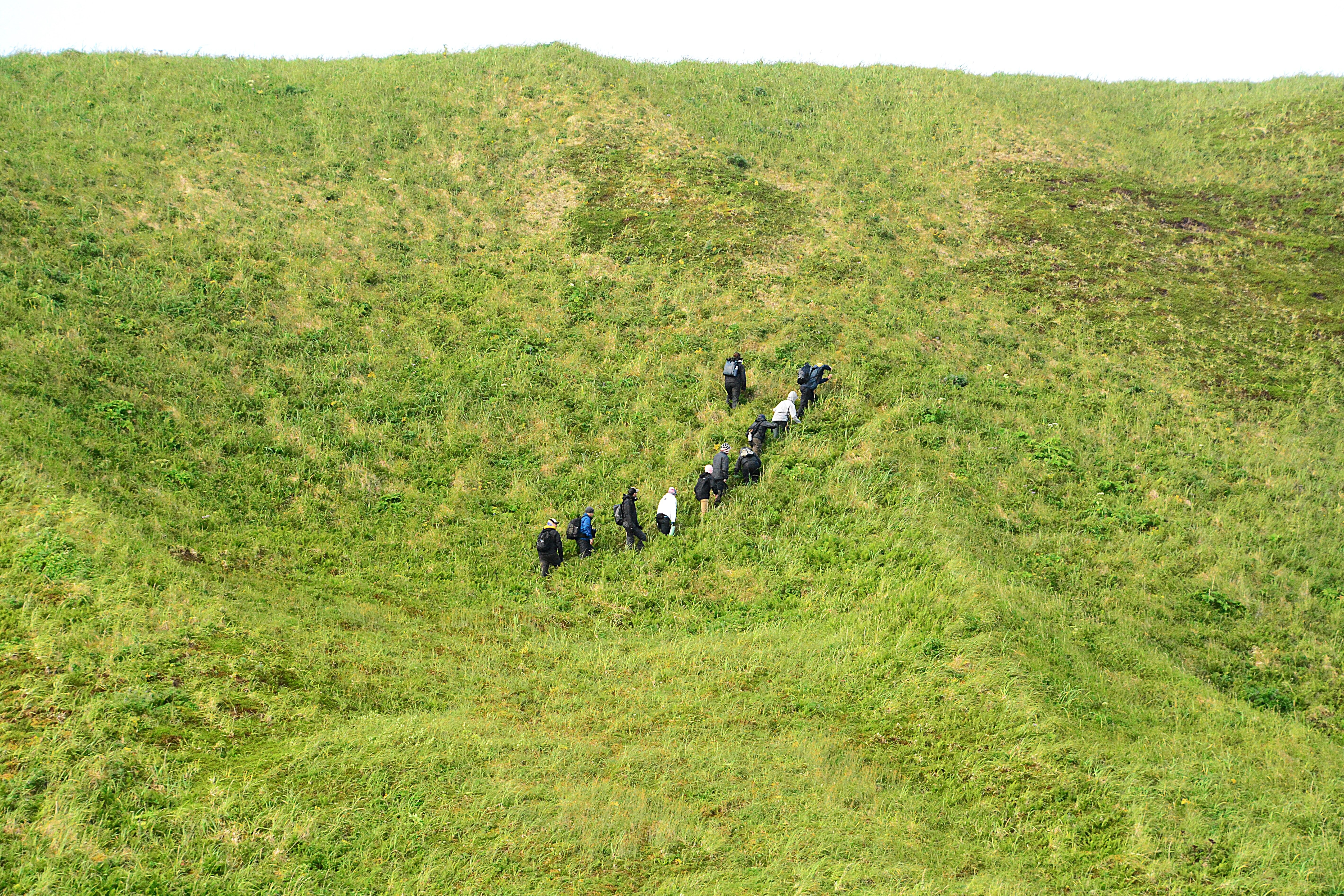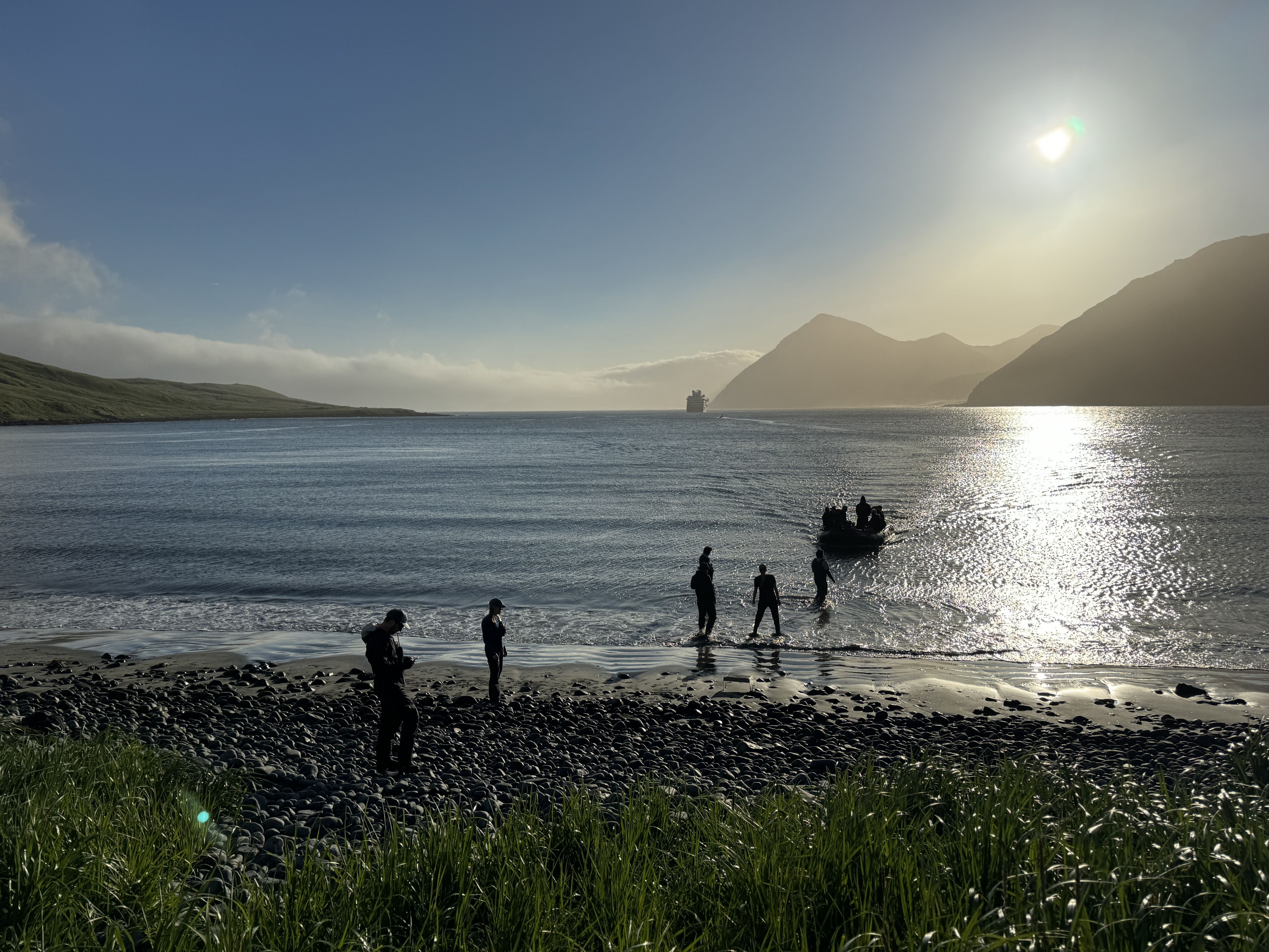 Our expedition landing this morning was in Tanaga Bay, on the southwest side of irregularly-shaped Tanaga Island. There were opportunities for a strenuous hike up a steep ridge and beyond, as well as exploration along the beautiful black sand beach. Many interesting curiosities were found during low tide along the expansive sandy shore, providing a variety of ways to use our imaginations and test and improve our photo skills. Glimpses of Tanaga volcano enhanced the backdrop and dense tundra vegetation covered the landscape above the high tide line. Birds observed included bald eagles, fox sparrows, black oystercatchers, and glaucous-winged gulls.