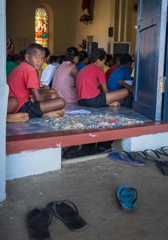 The morning was brilliant with color, the rich cobalt blue sea complimenting the deep and bright greens onshore. After breakfast, our Zodiacs swiftly delivered the remaining guests to shore for their outings. Once again, we loaded up into the local open-air buses. A hiking group headed directly to Bouma National Heritage Park for a more rigorous trek to view the park’s lovely waterfalls. Others opted for a gentler outing, first heading into a nearby town. As we approached the Catholic Wairiki Mission, we could hear the soft sounds of a chorus of voices drifting across the grass. To our surprise, our five-minute stop turned into twenty-five minutes as we discovered the large church was half full of schoolchildren, seated on the floor, singing beautiful songs. The acoustics and their lovely voices combined into an absolutely magical moment as we stood in the doorways, listening and taking photographs of their cheerful faces. It was a bit of unexpected magic both for us watching, and for the kids who were delighted to see us.