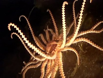 A favorite site for ROV-ing is Petermann Island, where Jean Baptiste Charcot overwintered in 1908 and made some of the recorded first underwater observations of the invertebrates in Antarctica. On this particular flight of the ROV, we found sunstars over a meter across, many of their 40 arms extended into the water column, waiting to catch a meal—something we first documented with the ROV for the USAP in 2003; sea spiders, more closely related to horseshoe crabs than spiders, move slowly along the bottom looking for their soft-bodied prey; finally, the monster of the day, a four-inch octopus, lying in wait.