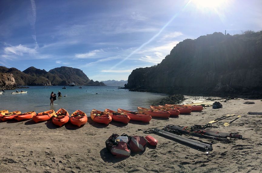 After an information-packed expedition photography talk and a tasty lunch, we anchored near Isla Danzante and set up for the afternoon to run the gamut of activities along the shoreline. Some hikers enjoyed a long or medium hike into the desert in hopes of spotting a snake or scorpion. The photographers practiced their skills photographing desert plants and landscape. In addition, many were interested in the bounty of the sea as they snorkeled, kayaked, and even tried their balance on stand-up paddleboards—all patrolling the shallow waters in search of the varied species of fish.