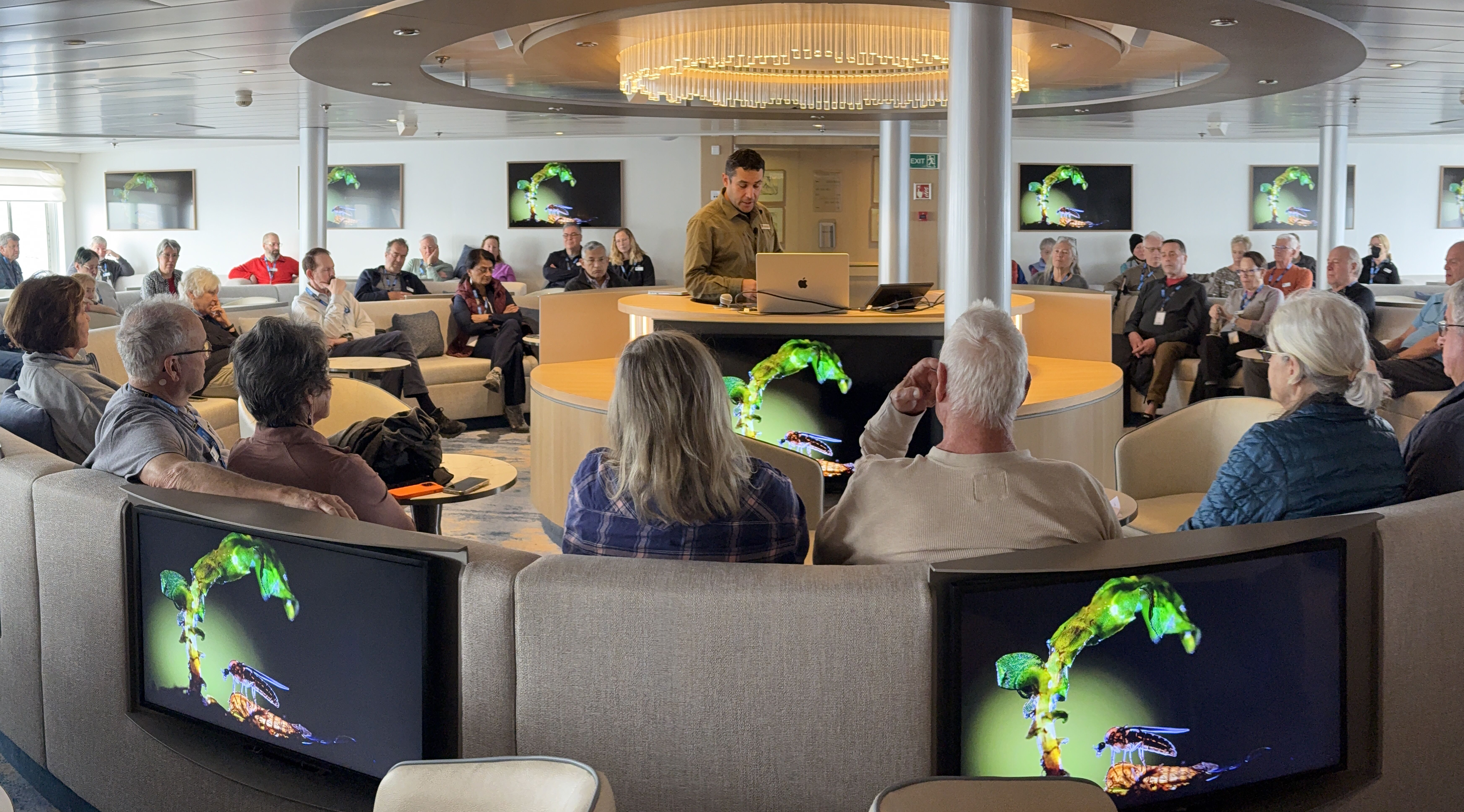 We woke to glassy calm waters and white as far as the eye could see, both on land and in the water. Overnight we’d made our way south to the Antarctic Circle and were pushing our way through icy waters, navigating the close islands and a small passage of water called The Gullet to arrive at our afternoon location for operations. We enjoyed a peaceful morning of spotting seals and sea birds.