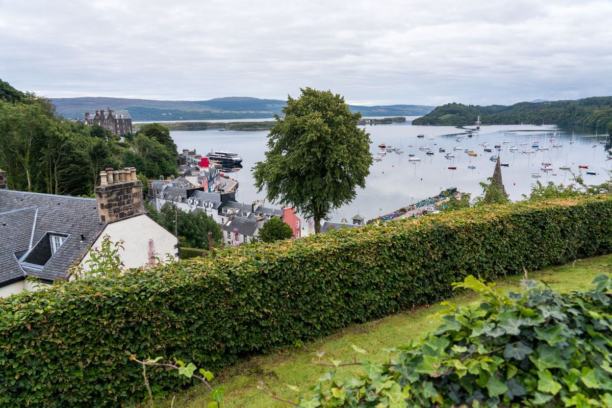 Tobermory is the principal settlement on the Isle of Mull. Created as a fishing village to provide employment at the time of the Highland Clearances, it is now a noted yachting harbor, a celebrated safe anchorage in the Inner Hebrides. The name Tobermory comes from the Gaelic for Mary’s Well—a feature that can still be found at one end of the bay, beside the whiskey distillery. There is a variety of good shops in town—a bookshop that also sells fishing tackle, an artisan bakery, and a chocolate maker. There is an aquarium, a small museum, and several hostelries, including The Mishnish which was conveniently situated near our berthing. The town has an upper level that is largely residential except for An Tobar, a small yet lively arts center, and the Western Isles hotel, which served as an operational center for transatlantic convoys during the Second World War.