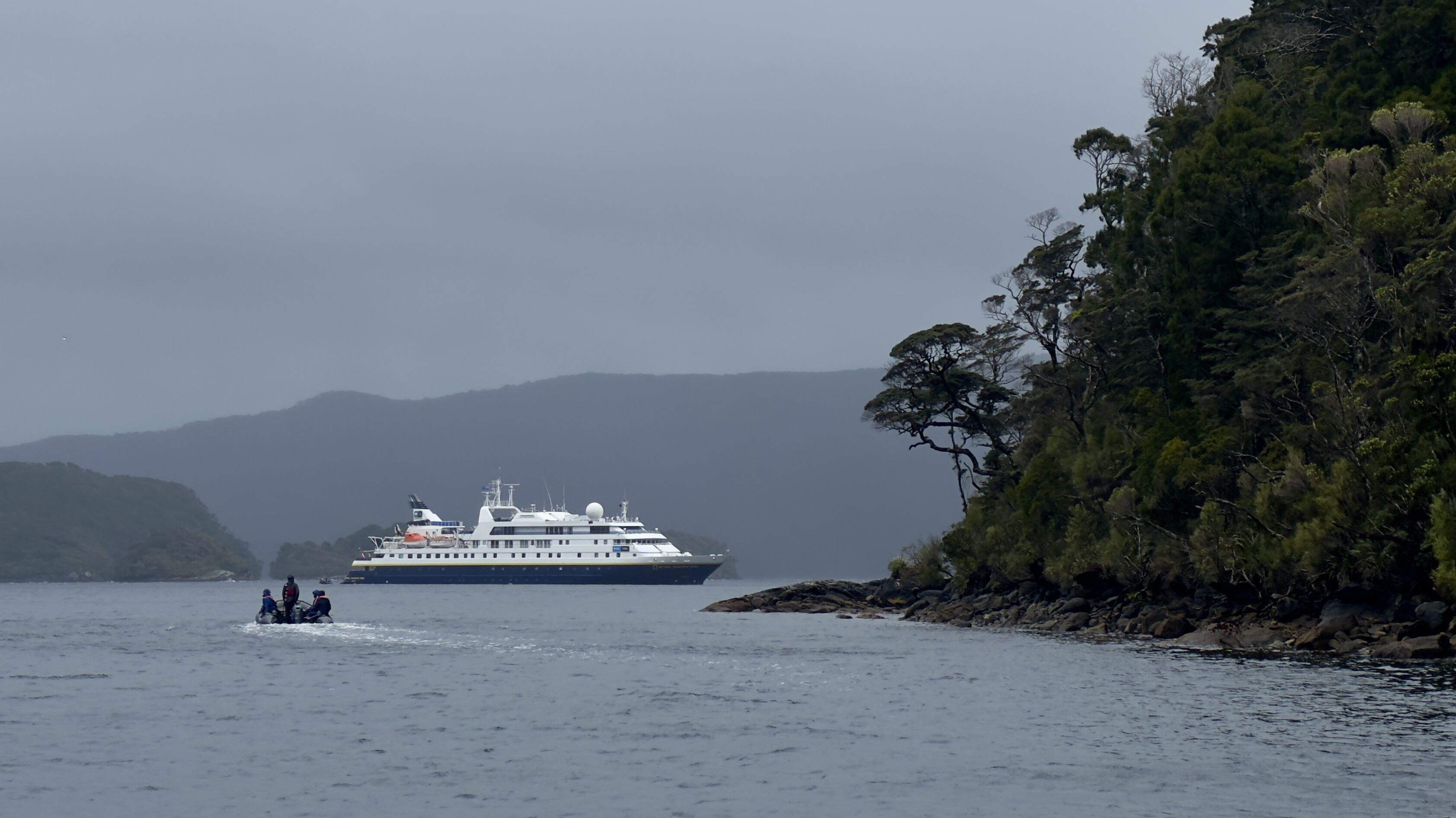 National Geographic Orion sailed all night to arrive at the remote Snares Island Group. These islands are incredibly pristine, with no introduced pests, and subsequently, a number of endemic land birds and the endemic Snares crested penguin are thriving here. Guests birdwatched from the ship all morning as thousands of petrels and shearwaters passed and the occasional group of penguins popped up to the surface.
