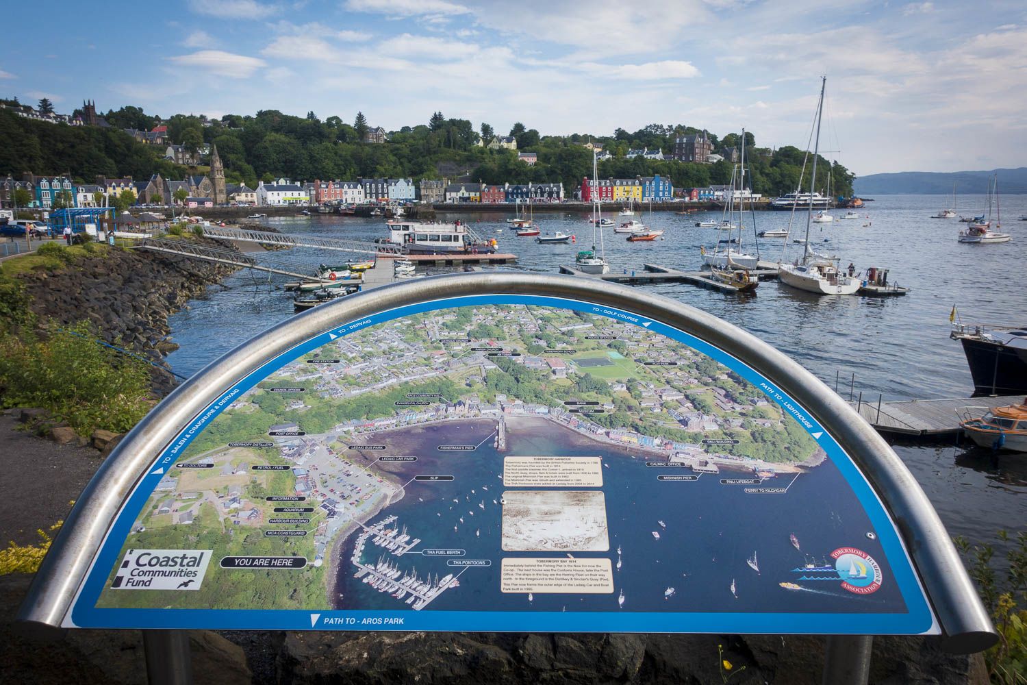 A still, bright morning greeted us in Tobermory on the north coast of Mull, perfect for the day’s journey into the small islands of the Inner Hebrides. But before heading out into the open ocean, we had a morning to enjoy the small town of Tobermory, with its colorful waterfront buildings and many shops and cafes. One group set off with Robin and Stewart to walk the coastal trail through a lush forest where native oak and Scots pine grow, along with an abundant amount of non-native rhododendron. The walk was a peaceful outing that ended at a waterfall, where Stewart explained some strategies for filming flowing water.