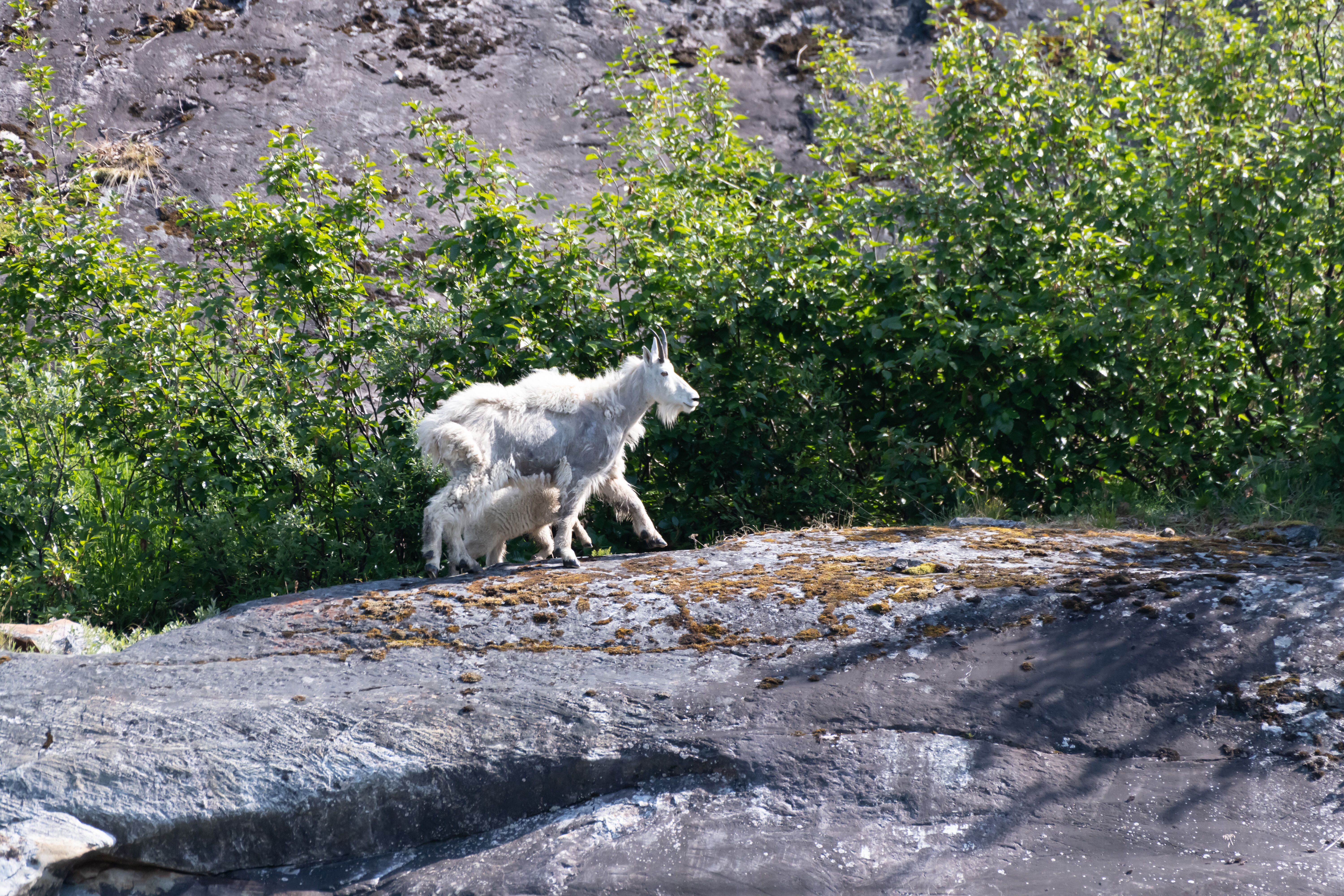 A high-pressure system moved over Southeast Alaska overnight, and when we awoke we were deep within Tracy Arm with a sunny sky and not a cloud in sight. A brisk morning turned warm as the sun rose higher and illuminated the deep waters of the fjord. We launched our Zodiacs just after breakfast and headed towards South Sawyer Glacier. Before we got far, we spotted mountain goats down low along the shoreline headed for patches of rockweed, which gave us superb views of these cliff-dwelling animals. The ice was pushed up right against the glacier face, providing an easy route for our Zodiacs as we positioned ourselves to view the mighty glacier. It was a quiet morning for the glacier, despite the sun, but we were kept entertained by the numerous harbor seals and their young pups. They lay on the bergs enjoying the sun and occasionally diving to hunt for food. We were lucky enough to happen across a recently born pup, and the afterbirth was being fought over by four bald eagles as well as numerous gulls and crows. As we finished our operations and prepared for lunch, South Sawyer awoke! We were lucky to witness two thunderous calving events just before our long cruise back towards Holkham Bay.