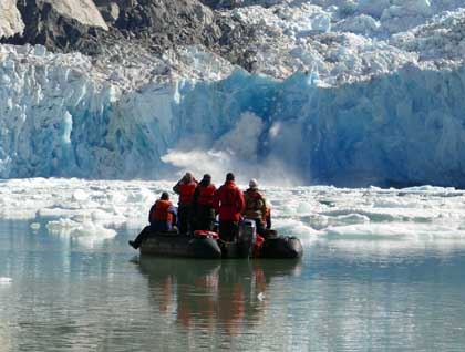 By mid-morning the National Geographic Sea Lion slowed near Sawyer Island, not yet in sight of a glacier but at the ice edge John Muir encountered in 1890, when he traveled to Alaska to better understand the glacial process. Cruising in our swift inflatable boats, we skimmed along the fjord wall, marveling at the tortured rocks and tiny waterfalls, and here and there a delicate magenta tuft of dwarf fireweed tucked into a rocky crevice. Above us several mountain goats browsed on tender Sitka alder leaves, moving easily across terrain so steep we had to crane our necks to see them.