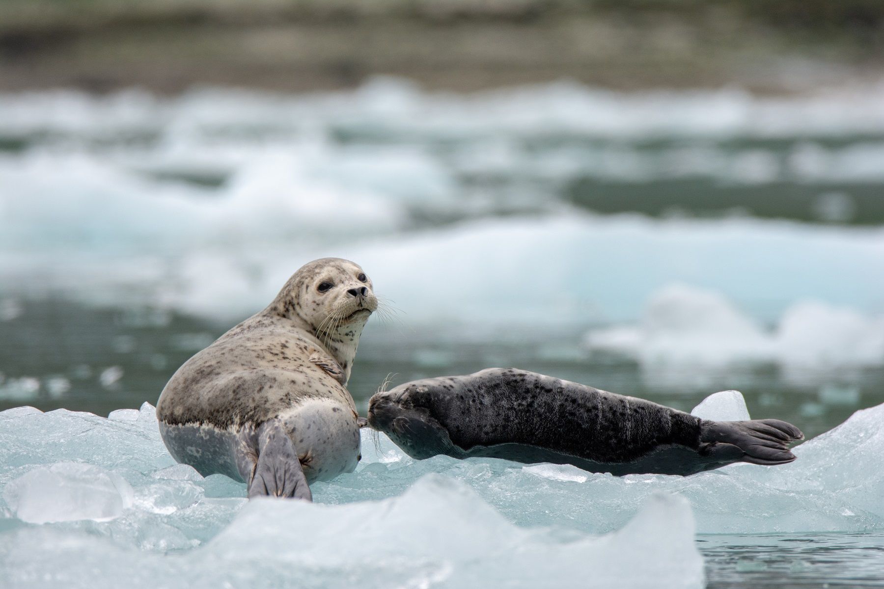 This morning, National Geographic Quest entered Tracy Arm/Fords Terror Wilderness to explore Endicott Arm. The accumulation of ice recently calved from Dawes Glacier was quickly drawn out by the strong outgoing tidal current, opening up a clear path to approach the face with Zodiacs. Among the bergy bits we cruised by, we delighted in the larger icebergs that served as temporary safe havens for harbor seals, many with young pups by their sides.