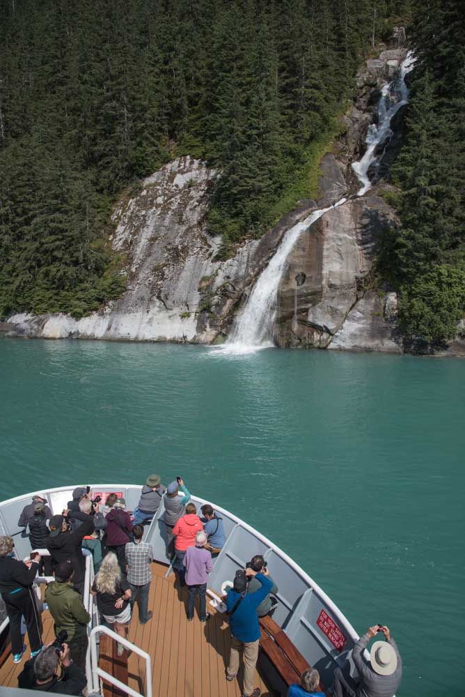During the morning, we explored the scenic cove of Pavlof’s Harbor on the southeast shore of Freshwater Bay, Chichagof Island, and area known for its healthy salmon stream. We were optimistic that we might still see a bear during our last day exploring Southeast Alaska. We were not disappointed! At the base of a small waterfall, we spotted a coastal brown bear casually gorging itself on salmon as we watched, spellbound, from the safety of our expedition landing crafts only a few yards away. The bear, enjoying its meal, seemed oblivious or at least indifferent to our presence. For nearly an hour, we watched the animal devour fish after fish until it calmly walked up the river bank rocks and into the forest. Late summer and early fall is the time to fatten up and prepare for the long winter ahead. Come November and the onset of snow, brown bears will leave the coastline and head to higher elevations near or above treeline. Biologists debate whether bears truly hibernate or just den up and sleep during the winter. Pregnant sows will give birth to tiny, one-pound cubs while sleeping within the den and nurse them until spring. We returned to the ship after our morning adventures for lunch and were relaxing in the lounge when another bear was spotted on the beach south of Pavlof Harbor. Although more distant than our first encounter, we all enjoyed another exceptional sighting of a coastal brown bear. But the wildlife viewing wasn’t over yet! As we sailed south along Chatham Strait, we encountered a pod of killer whales swimming nearby. Crusing alongside the pod, we counted a group of about ten that included one large male. His large dorsal fin rose nearly six feet above the water‘s surface. Guests spent the remaining time reading or chatting with friends. We wrapped up our day with the captain‘s dinner followed by the guest photo slideshow, which we enjoyed as we sailed toward Sitka through Peril Strait. Have we seen it all? Hardly! But we left with a sense of fulfillment, knowing that we saw a lot! And maybe one day we‘ll return and finally see some elusive moose!