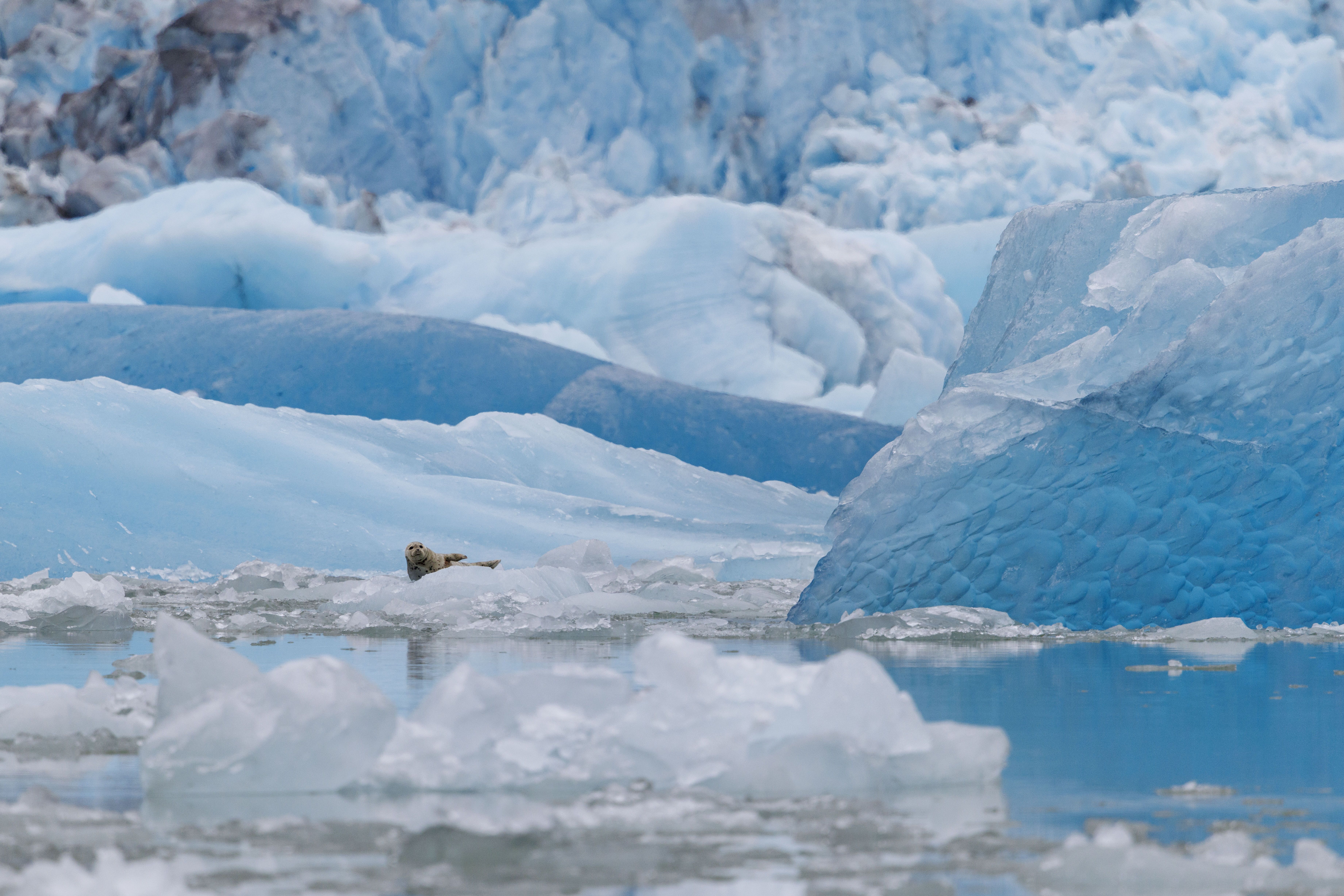 As we crossed the bar, the morning light came through the misting clouds to reveal the beautiful landscape of the Tracy Arm-Fords Terror Wilderness. National Geographic Sea Bird made its way up the fjord. Sheer cliff faces revealed themselves all around us on our way to see the South Sawyer Glacier. Once we arrived at the glacier, the icebergs impressed everyone with their incredible colors and shapes. Harbor seals rested on the floating ice. It was a magical day in Tracy Arm.