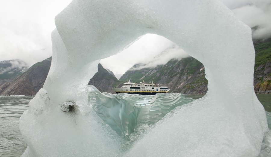 We were stunned by the deep blue color of the glacier and learned from Flip Nicklin that bright sunlight makes the blue of the ice look much paler, so we were fortunate to be there on a misty day as the blue of the ice looked deeper and brighter. Zodiac cruises were the activity of the day, and we went in two rounds for the better part of two hours each. We were treated to spectacular glacial sounds and calving activity. We got to see a “shooter” and many cascades of ice going into the sea. By the time we returned to the ship, the whole face of the glacier had been changed, and there was a great deal more ice in the water. We saw many more harbor seals on our way out as well. It was a wonderful evening afterward, highlighted by a great team of naturalists playing the “Liars Club.” Another remarkable day aboard National Geographic Quest