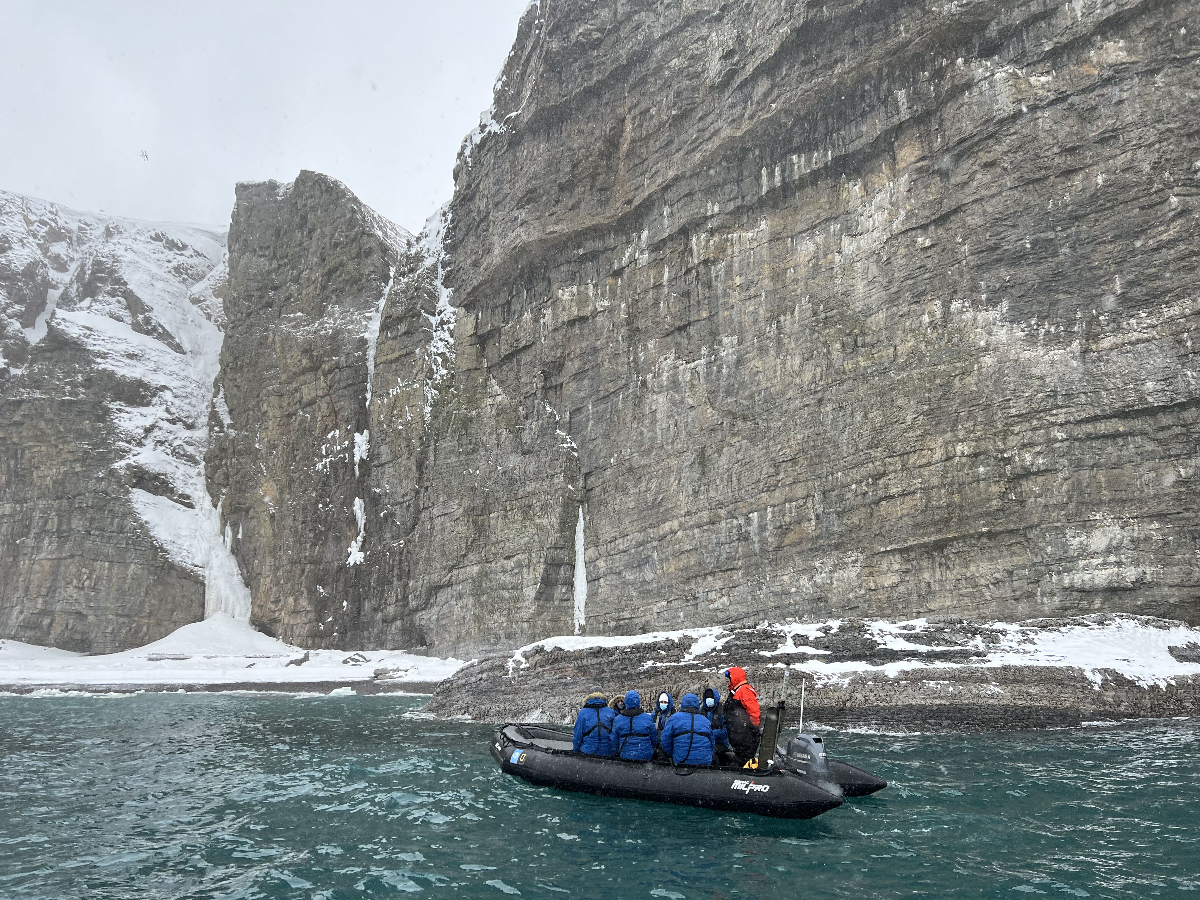 In a jolly mood, our guests enjoyed lunch while showered with sunshine between the mountains. All the while, our captain was repositioning the boat for the Polar Plunge! That is right! We only had five brave volunteers, but all five jumped into the icy waters (43 degrees) and swam beneath a flowing waterfall. The pre-dinner glacier presentation by Dr. Steven Cunha was only just finishing when bears were spotted on the beach. What a lovely surprise for our guests before they filled their tummies.