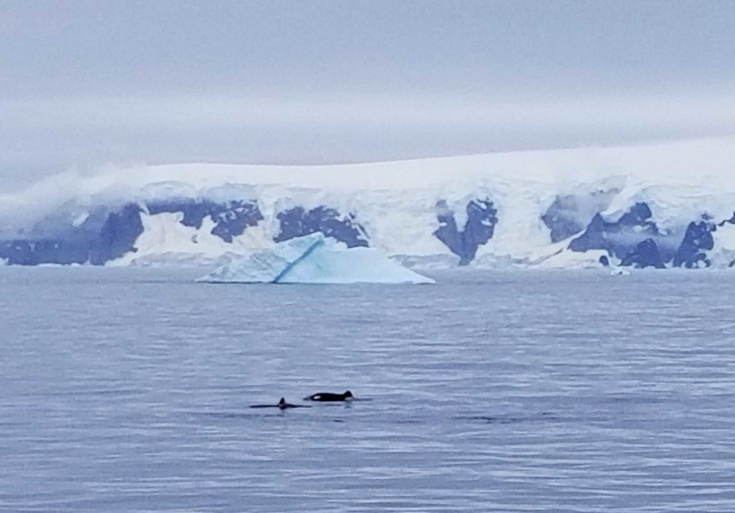 In the afternoon, we spotted three killer whales in the Orleans Strait. We watched the beautiful whales swimming and diving. The curious thing about two of the whales was their dorsal fins were truncated, possibly by entanglement in fishing lines near South America. These were Type A killer whales, which eat a wide variety of animals such as toothfish, seals, and minke whales. All the time, there were dozens of unnamed glaciers and mountains onshore in the complete polar wilderness.