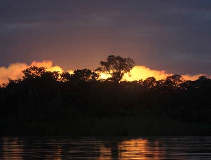 As we continued, we encountered one of the most representative species of plants in the Amazon, the giant water lilies, known very well locally by its scientific name, Victoria amazonica. This beautiful plant, with its enormous leaves capable of supporting the weight of a small child, grows in side channels and standing bodies of water through much of the Amazonian floodplain. Precisely at sunset, a massive lotus-like flower bud rises slowly above the surface of the water. Triggered by the falling light, the flowers open rapidly, showing their exquisite and brilliant white petals. The flower’s fragrance, which had been growing in strength since early afternoon, reaches a peak of intensity. The same biochemical process that generates the scent also increases the temperature of the central part of the blossom by exactly 11 degrees Celsius above whatever the air temperature happens to be. The combination of color, odor, and heat attracts a swarm of beetles. As the temperature cools, the flower begin to close, trapping the beetles within the blossom. The next day, just before dusk, the male anthers release pollen, and the beetles, sticky with the juice of the flower and once again hungry, are finally allowed to go. Climbing over the anthers, the beetles become covered with pollen, which they then carry to the stigma of another flower, thus completing the flowers’ cycle.