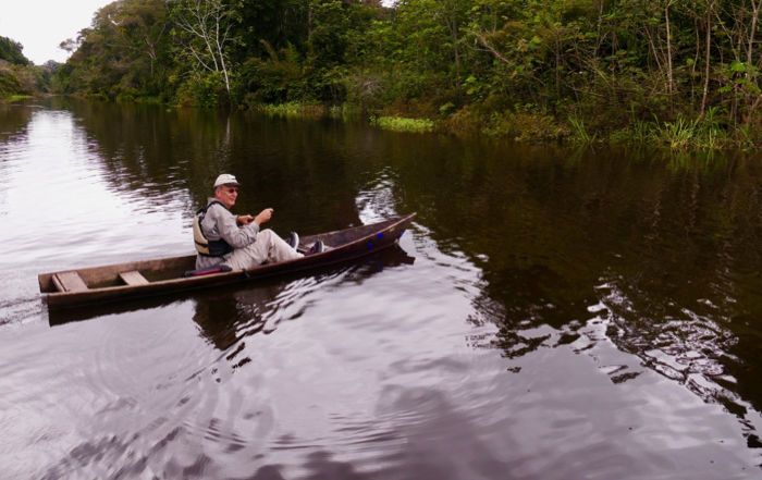Halfway through the expedition, we are now accustomed to our 5:30 am wake-up call, and well aware that an early start means cool river temperatures and abundant wildlife. This morning didn’t disappoint. Excursions up the Ucayali River and Belluda Creek revealed monk saki monkeys, squirrel monkeys, colonies of macaws, and several hawks, all seen from skiffs, canoes, and paddle boards! We extended our afternoon excursion well past dusk, seeking out several juvenile white caimans in the wetlands of the Dorado River.