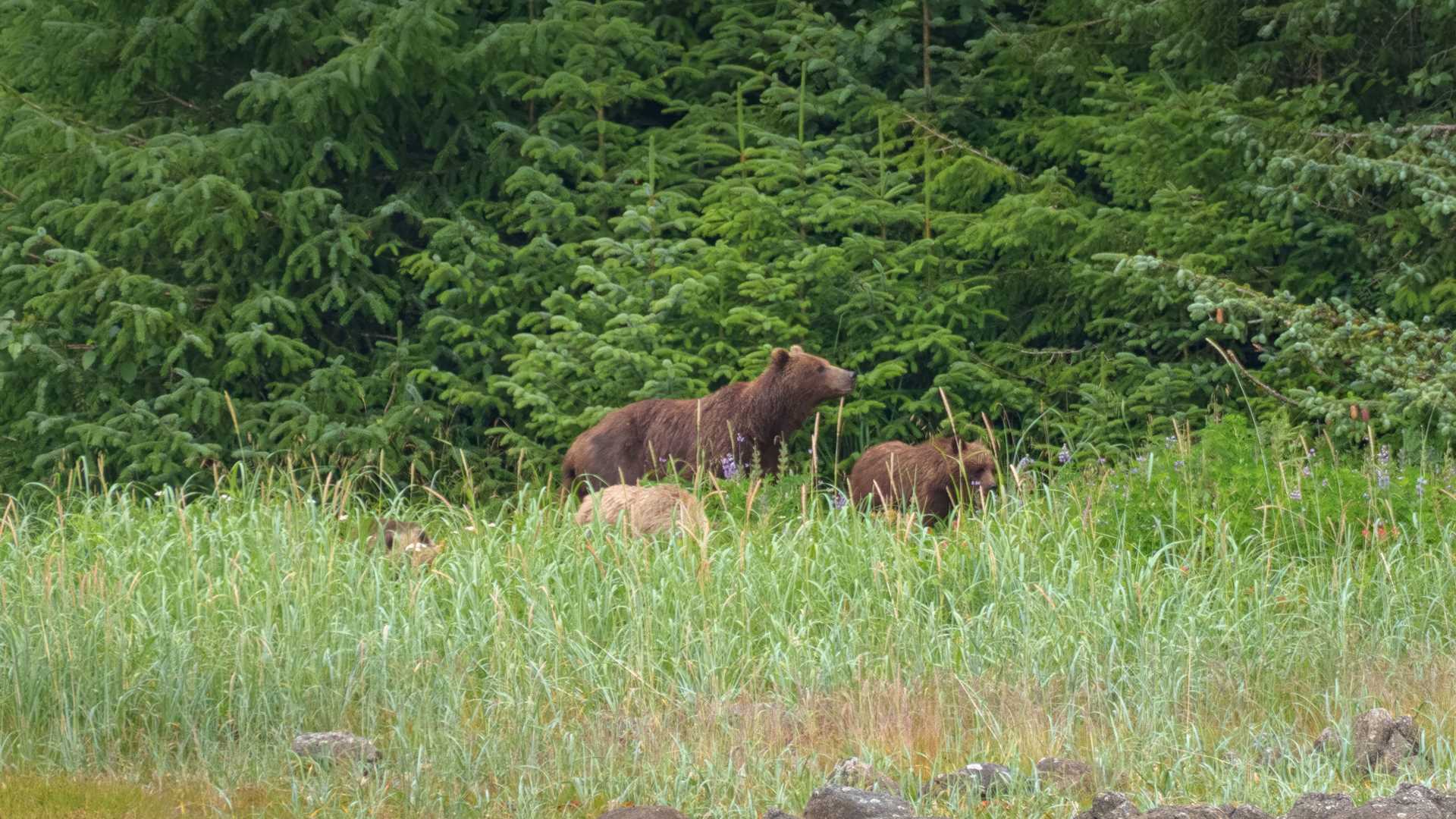 After seeing several tantalizing bear tracks and piles of scat, our searching was rewarded this afternoon with an unforgettable sighting of a mother bear and a trio of two-year old cubs! While some bears catch one sight of humanity and bolt for the woods, these four bears allowed us to watch for almost half-an-hour!