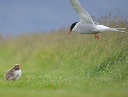 On the short walking tour, we put the stick flags to good use and had many great photo opportunities. Puffins are circling overhead, heading out to sea, and returning with fish. Downy baby terns crawl through the tall grass and meet their parents for feeding. Eider ducks relax along the rocky beaches, happily trading some down from their nests for a safe living space close to their human protectors. The volcanic backdrop is carved into classic hanging U-shaped valleys by glaciers long since gone, and a stiff wind blows steadily from further up in the fjord.