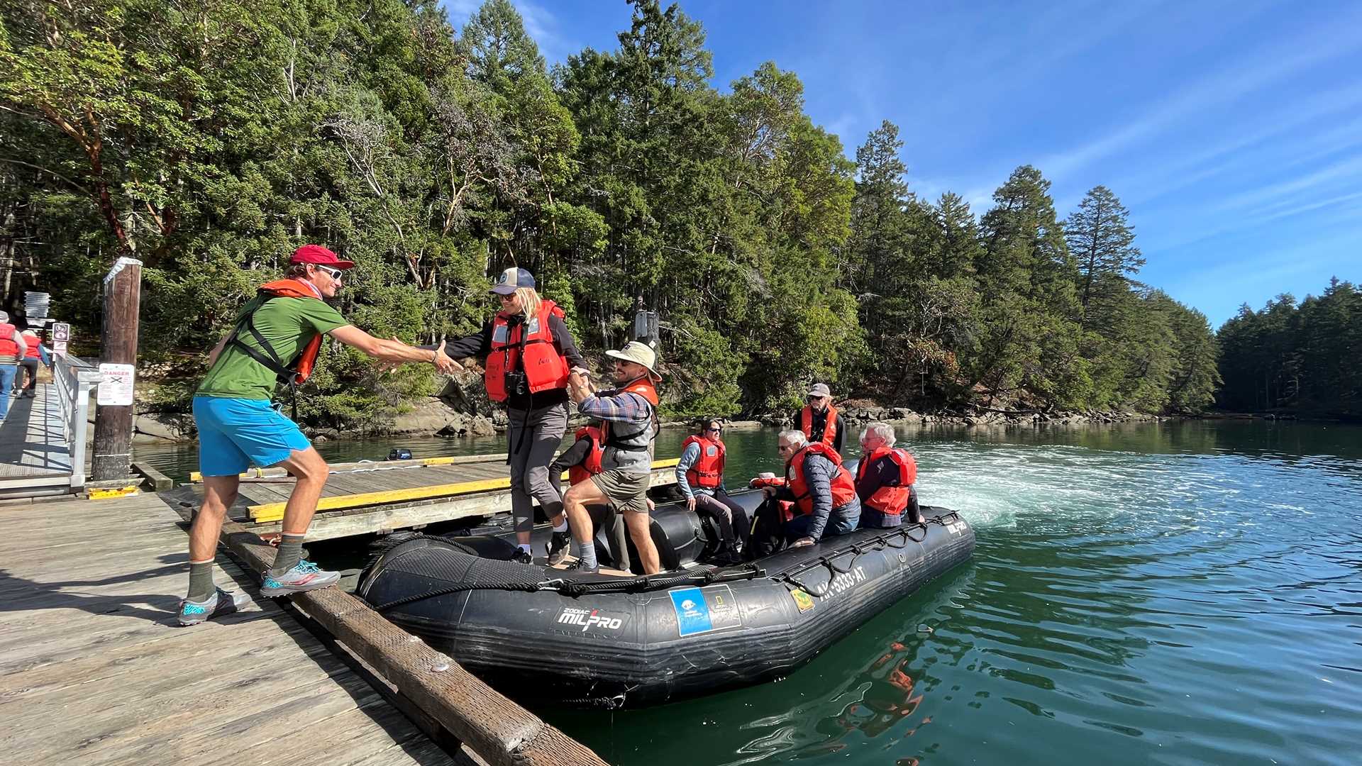 Wow! What a gorgeous day as we sailed southbound toward sunrise and the Gulf Islands. After a delicious breakfast we encountered several active humpback whales, giving us a fun treat glistening in the sunlight. The lounge was host to a riveting presentation on pinnipeds by naturalist Andy Putnam and a smartphone presentation by photo instructor Alex Rubenstein. However, the main event today was a lovely afternoon anchored at Wallace Island when guests disembarked the ship for a series of Zodiac tours, kayaking, and hiking options!