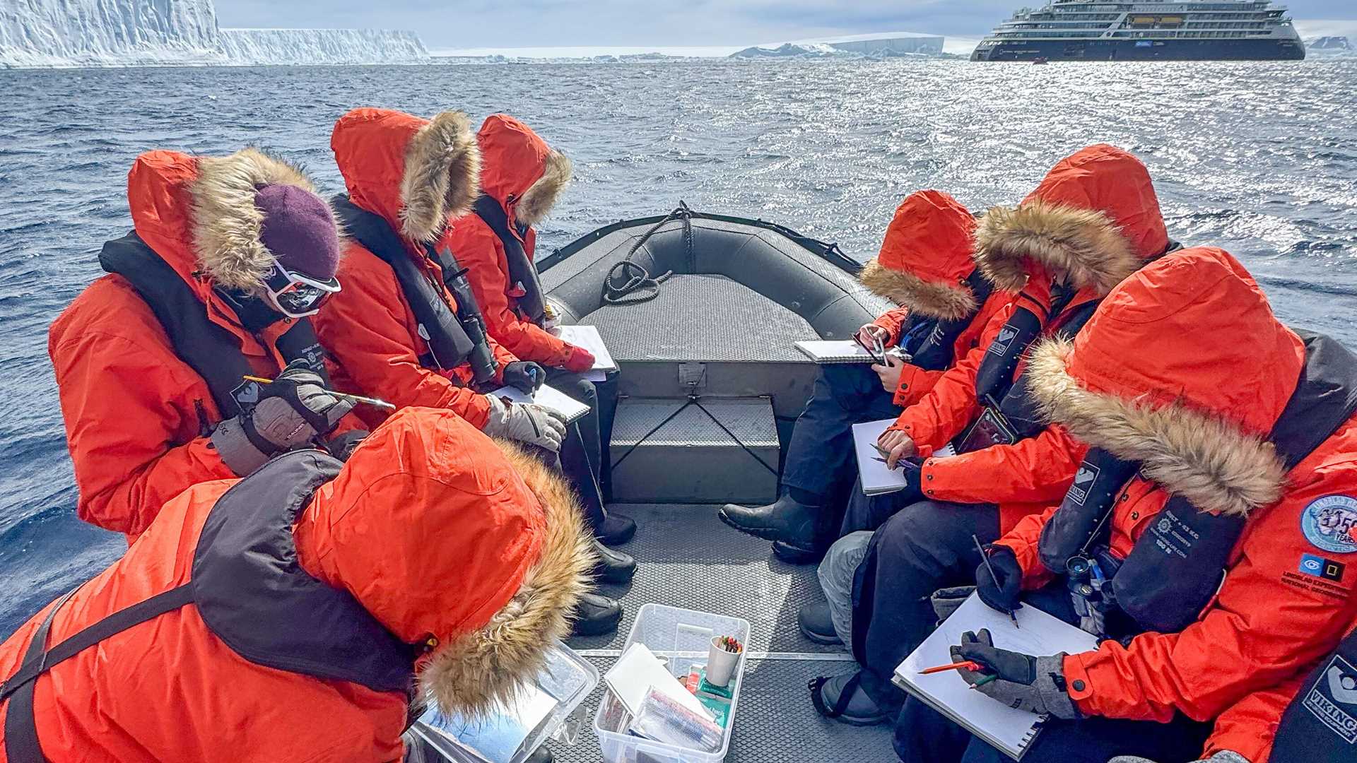 Today’s experience on National Geographic Endurance started with a meditative cruise in the Weddell Sea. We painted among glistening tabular icebergs and swimming gentoo penguins.