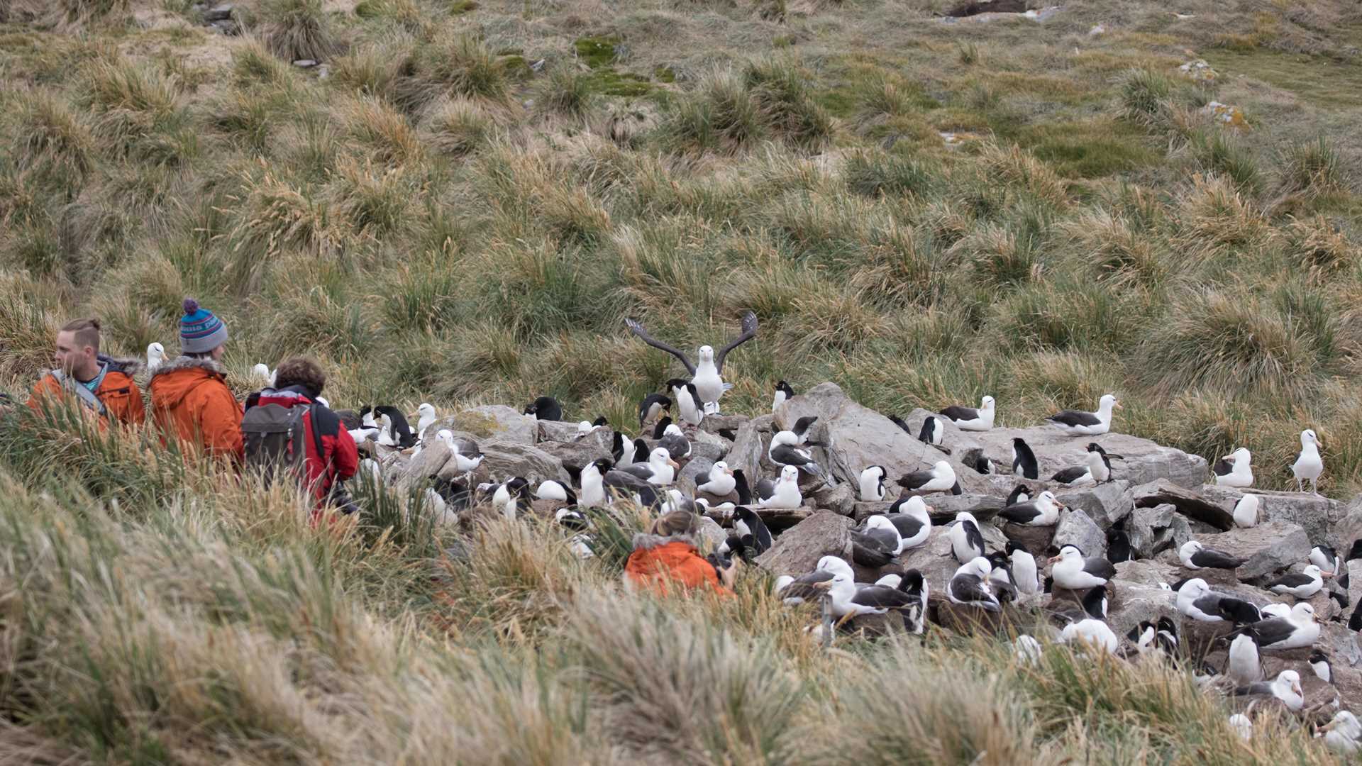 An area of cliff edge had been fenced off from the resident sheep in order to protect the tussock grass and nesting slopes for the birds. Winding our way through the tussock we came upon the amazing sight of hundreds of black-browed albatross and rockhopper penguins. For the majority of the morning people were mesmerized by the coming and going of birds and their frantic antics displaying to potential mates. As noon approached people made their way back to the landing jetty in the local Land Rovers.