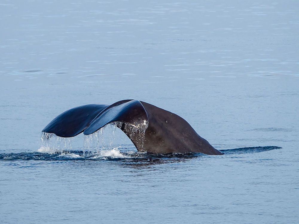 We were greeted by the bushy blow of whales on our arrival! The low dorsal fin sitting on a hump was particularly noticeable when the whales arching their backs for a dive. Their flukes gave us the species: humpback whales. Humpbacks are fast and active lunge feeders. Their morphology allows them to open their jaws widely and distend their throats to take in huge mouthfuls of water during feeding. They can eat two tons of krill per day.