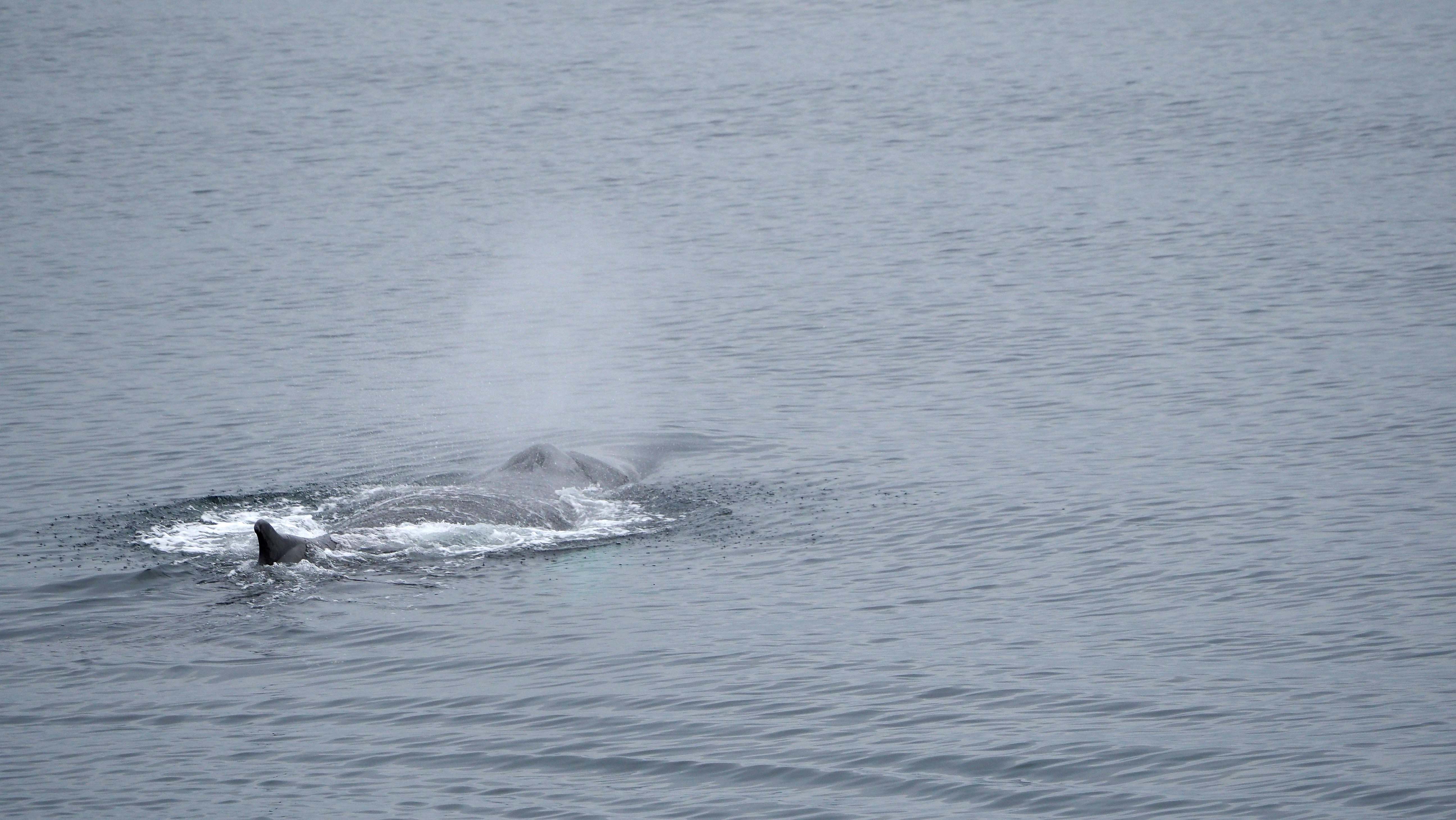 We were greeted by the bushy blow of whales on our arrival! The low dorsal fin sitting on a hump was particularly noticeable when the whales arching their backs for a dive. Their flukes gave us the species: humpback whales. Humpbacks are fast and active lunge feeders. Their morphology allows them to open their jaws widely and distend their throats to take in huge mouthfuls of water during feeding. They can eat two tons of krill per day.