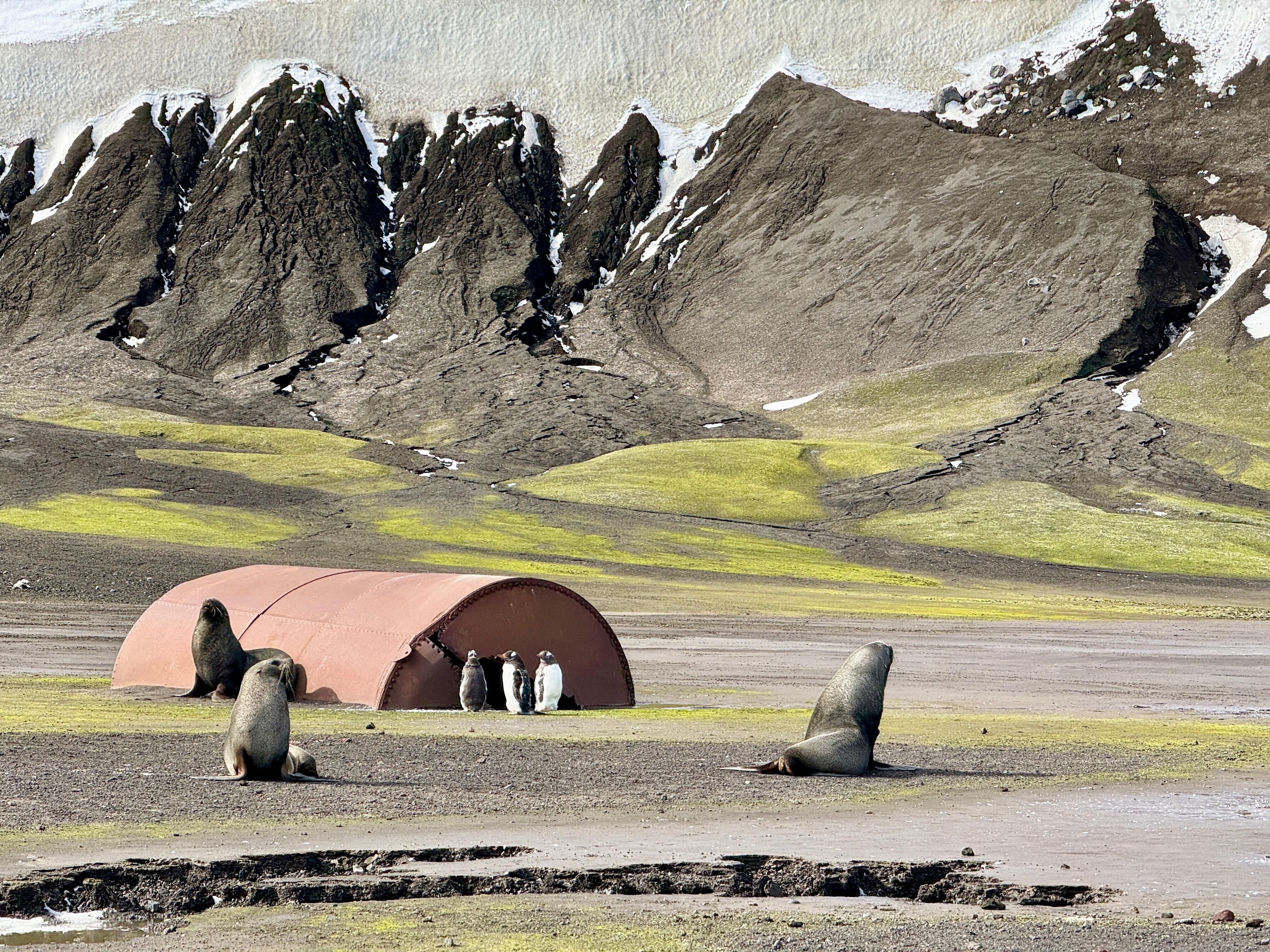 While we waited for the wind to ease, we were offered a fascinating educational program on board. After lunch, as expected, the wind dropped to a manageable level, and we took to the Zodiacs which deposited us ashore at Whalers Bay. Here we explored the famous historic site featuring many structures from an early 20th-century whaling station. Some of us also undertook a two-mile roundtrip hike along the steaming beach and up onto the caldera rim where we peered through a huge gap in the rock, known as Neptune’s Window.