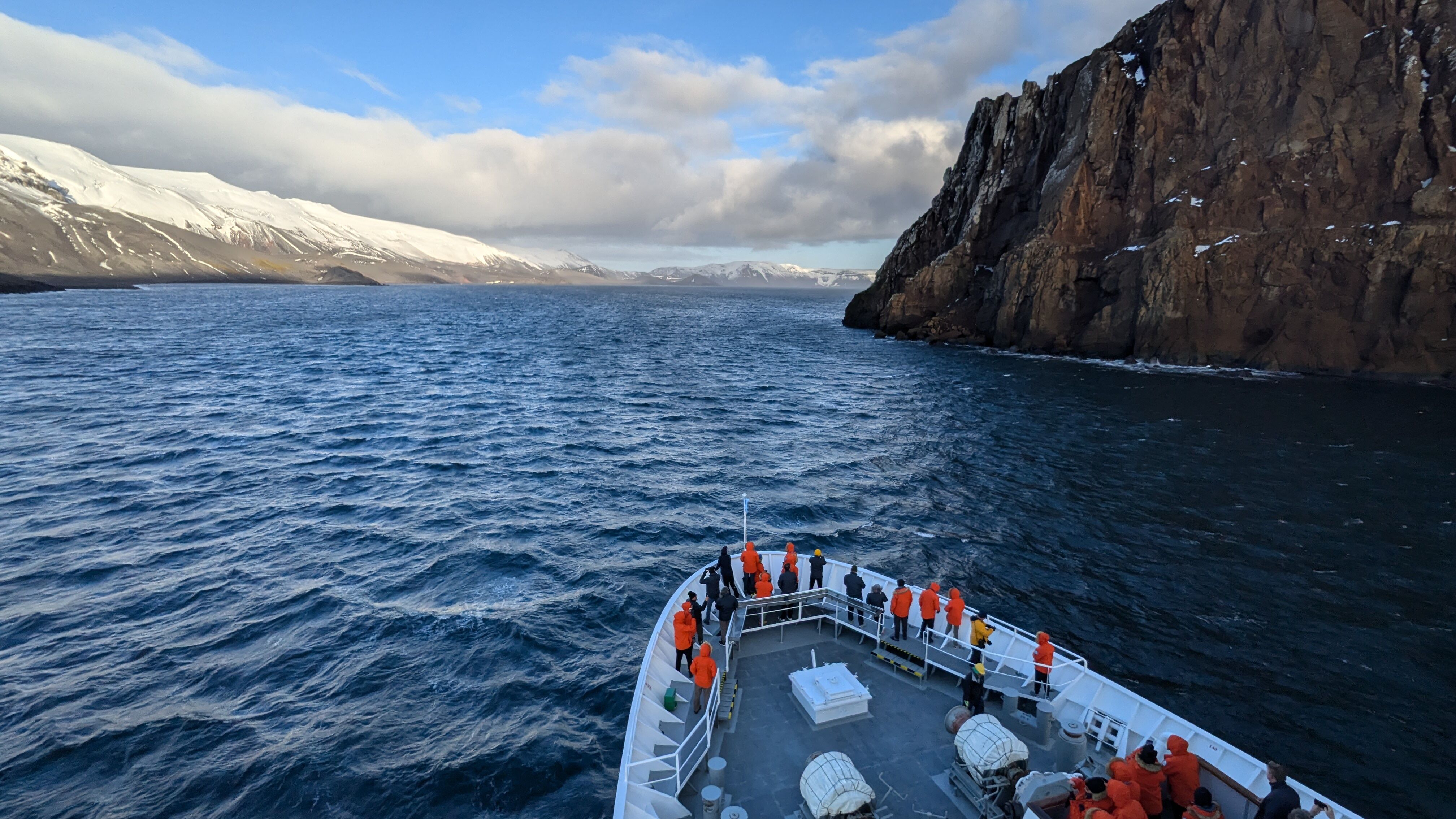 Early this morning, we found ourselves in Bransfield Strait. Windy conditions made for excellent viewing of charismatic seabirds, such as black-browed albatrosses, gray-headed albatrosses, southern giant petrels, and pintado (Cape) petrels. We all gathered on deck for our passage through Neptune’s Bellows, the narrow entrance to the huge, flooded caldera of the ancient volcano now known as Deception Island.