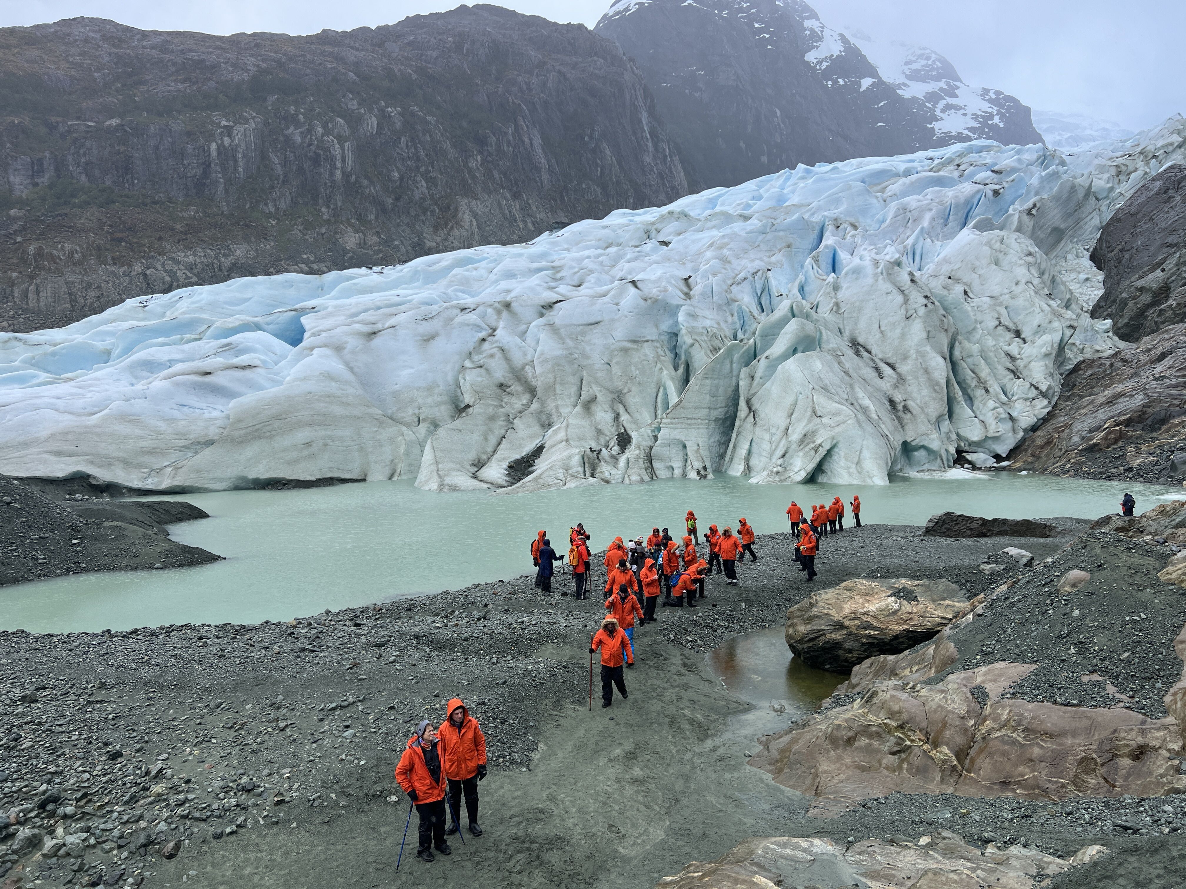 Later in the afternoon, we visited Bernal Glacier. We walked through a vegetated area with small trees, shrubs, and mosses, and all the while, we could see the white and blue glacier ahead of us. We walked past shallow turquoise pools of meltwater, then over small rocks deposited by the receding glacier, and eventually, we arrived near the glacier’s face.