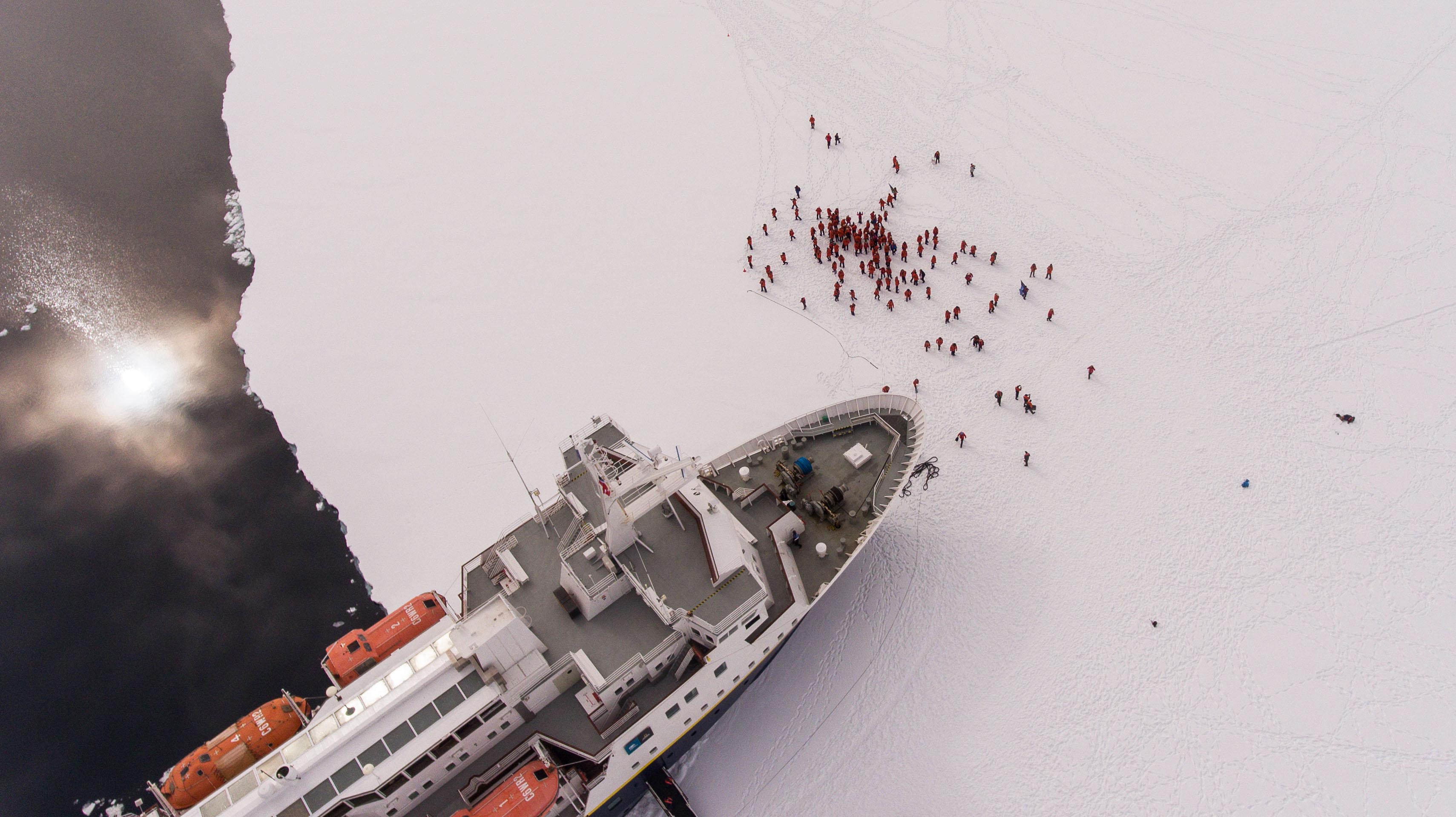Happy Thanksgiving from Antarctica! Having found a large piece of shore-fast ice (sea ice that is attached to land and therefore stable) the captain parked the ship in the sea ice for the evening. We woke up to a cloudy but beautiful day, the gangway was lowered after breakfast and we were able to go for a walk on the frozen ocean. Many didn’t think about the 1,500 feet of ocean beneath our feet or the six feet of ice we were walking on. The clouds lifted and the surrounding landscape was exposed. Beautiful mountains and tall cliffs were all around us. Several seals and penguins came out of the water near National Geographic Explorer to see what all the fuss was about. Many guests built snowmen, some walked the perimeter, a few even jogged for a unique Antarctic workout. The hotel department served hot chocolate with an added kick to top off our experience. After a group photo was taken in front of the bow it was time to extract the ship from her icy berth and move on to other adventures.