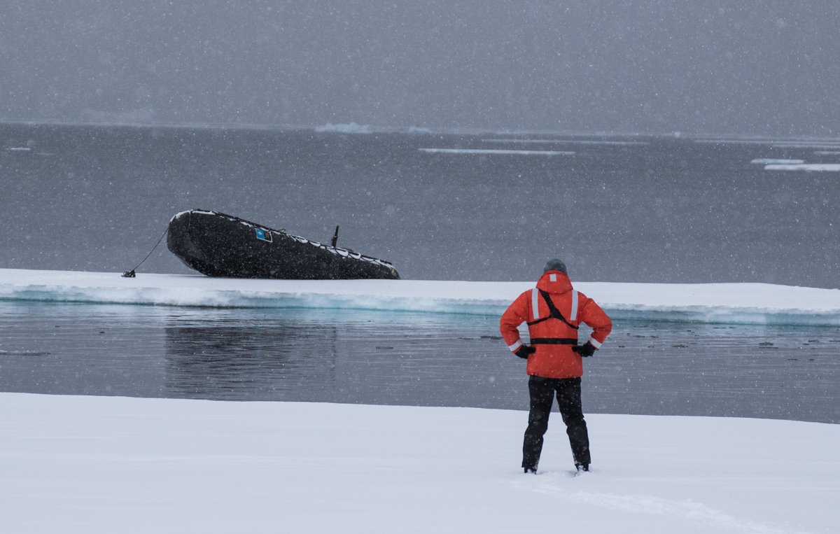 This morning Captain Skog and crew parked the ship in the fast ice of Wilhelmina Bay allowing us to walk on water after breakfast. It was an atmospheric Antarctic kind of day complete with snow falling, snow angels and snowmen. Like kids again we enjoyed the essence in the air, the beauty of fresh snow and the occasional views of the Danco Coast and Forbidden Plateau.