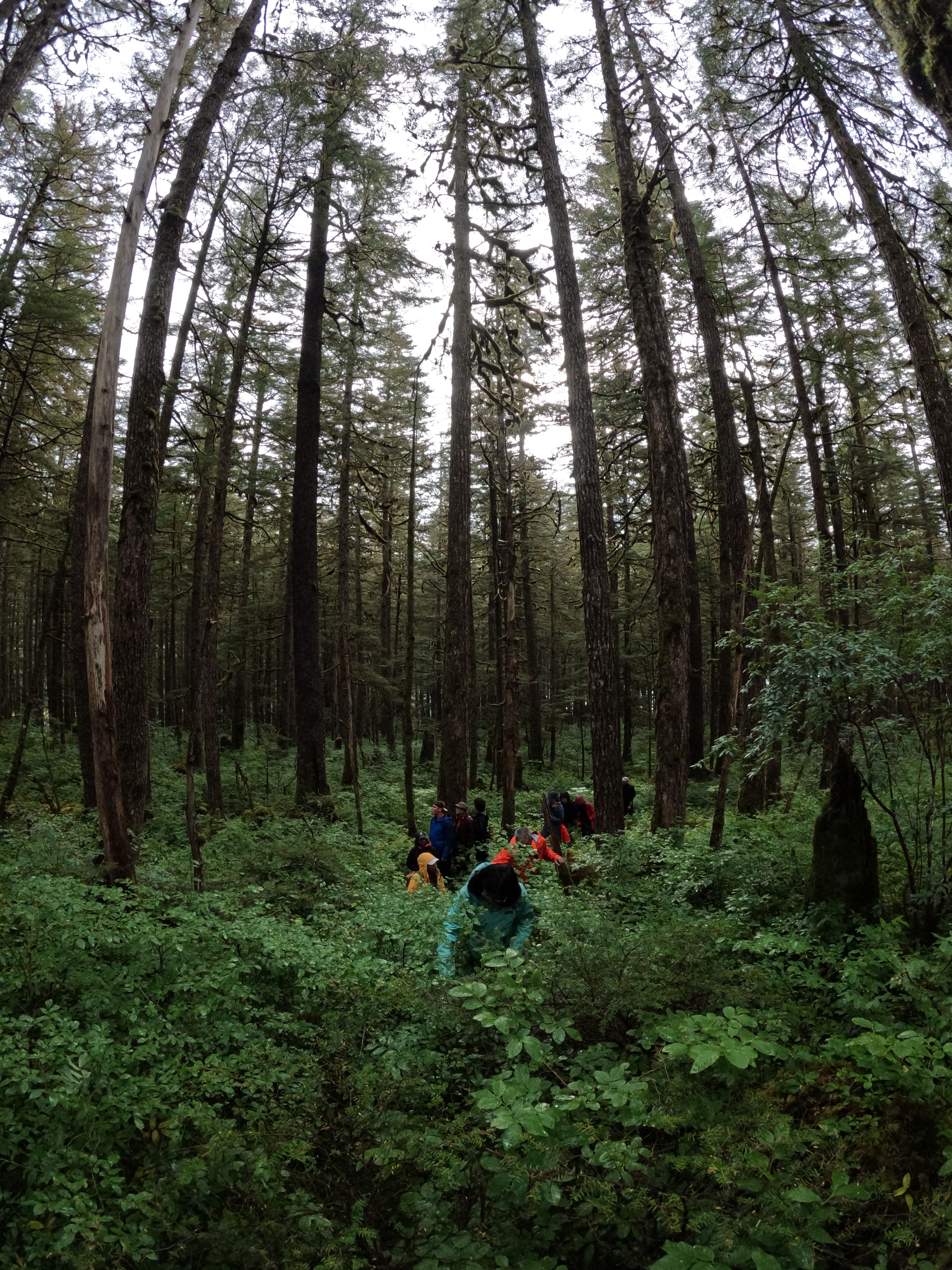 What began as a rainy morning aboard National Geographic Venture turned into high clouds with the occasional peak of sunshine as we traversed Williams Cove in Tracy Arm-Fords Terror Wilderness. Thirty-three people with the spirit of Alaskan adventure decided to explore the forest via bushwhacking. We found immense thickets of juicy, ripe blueberry bushes, patches of bright red watermelon berries, and to our delight, a muskeg with a central pond and lilies!